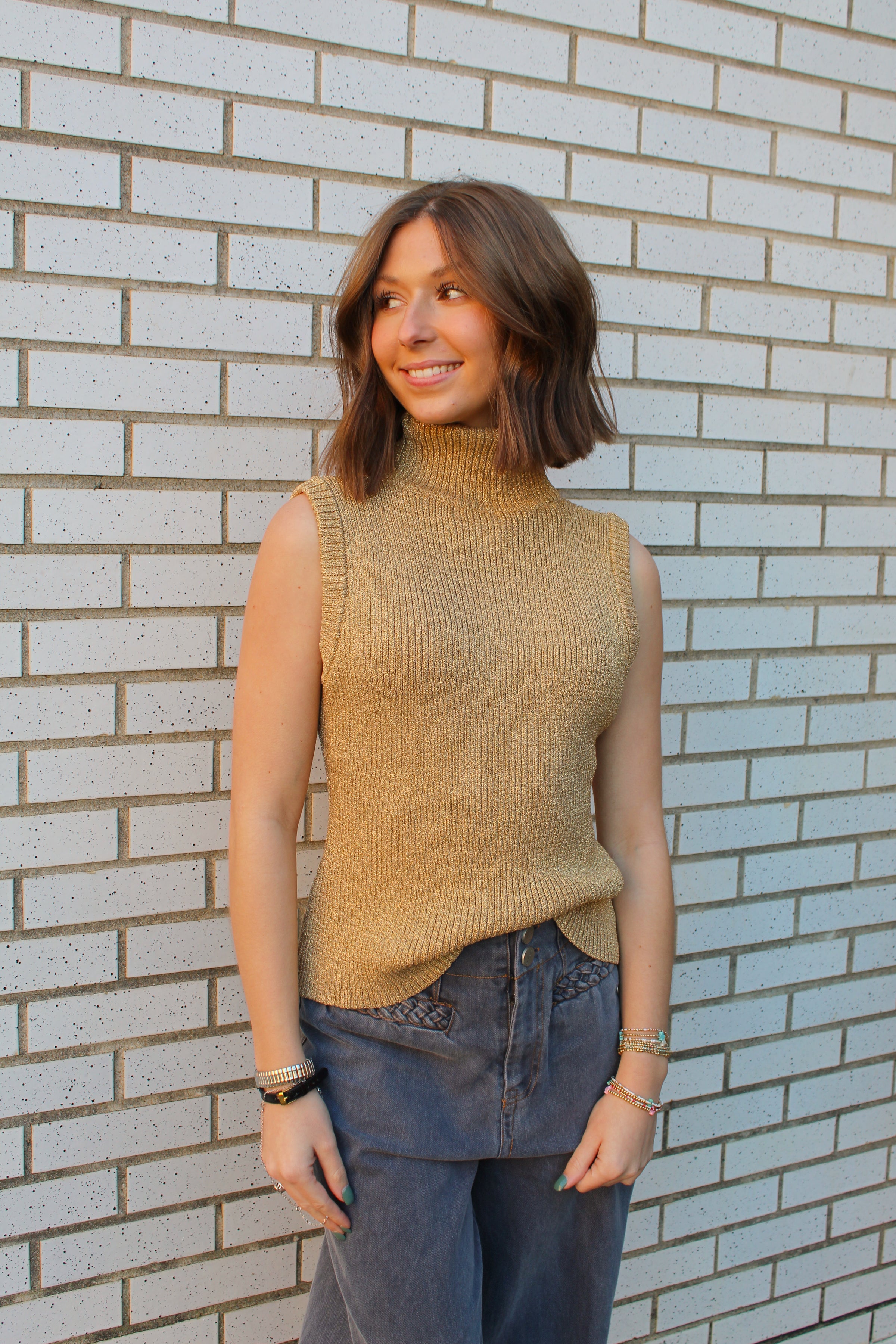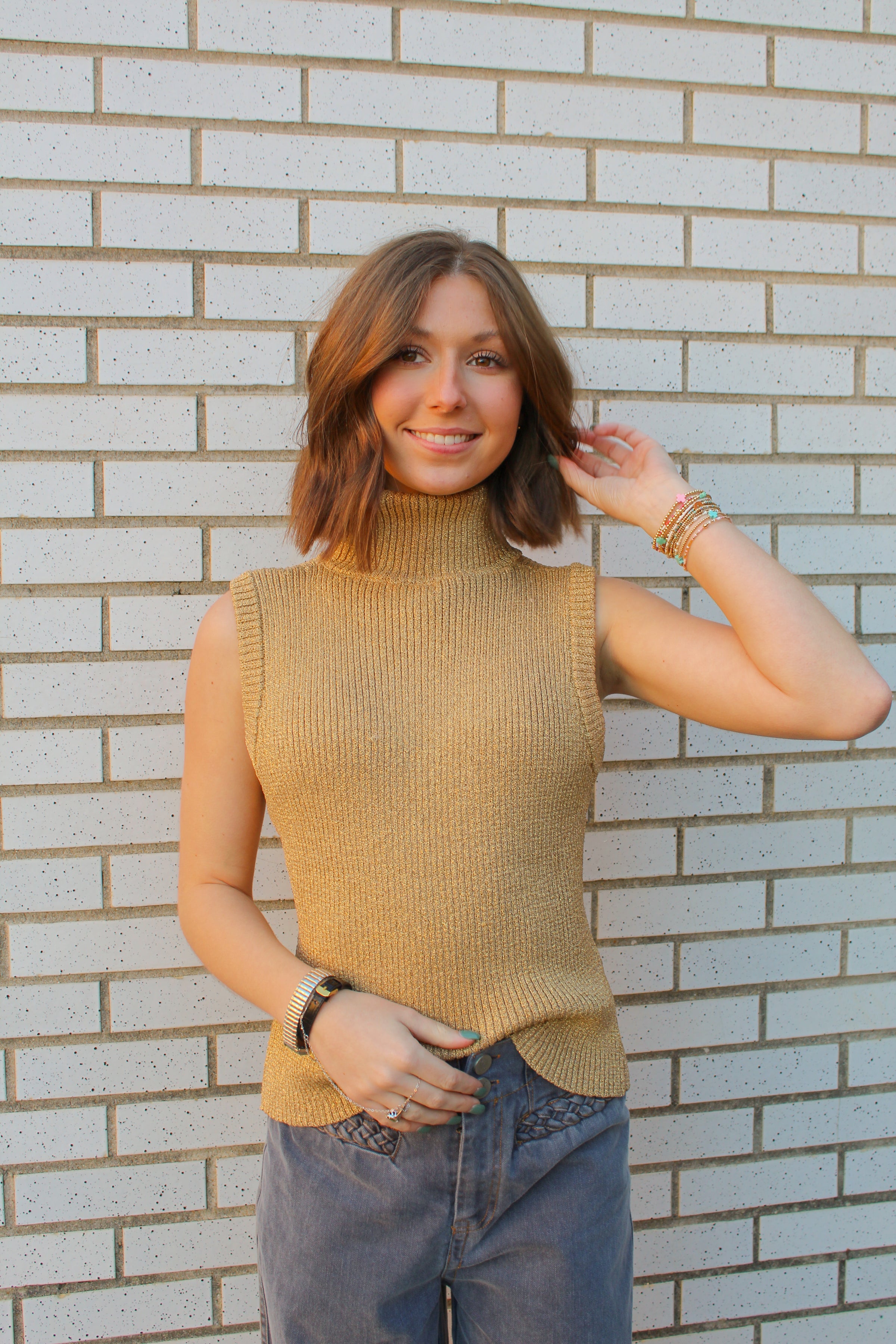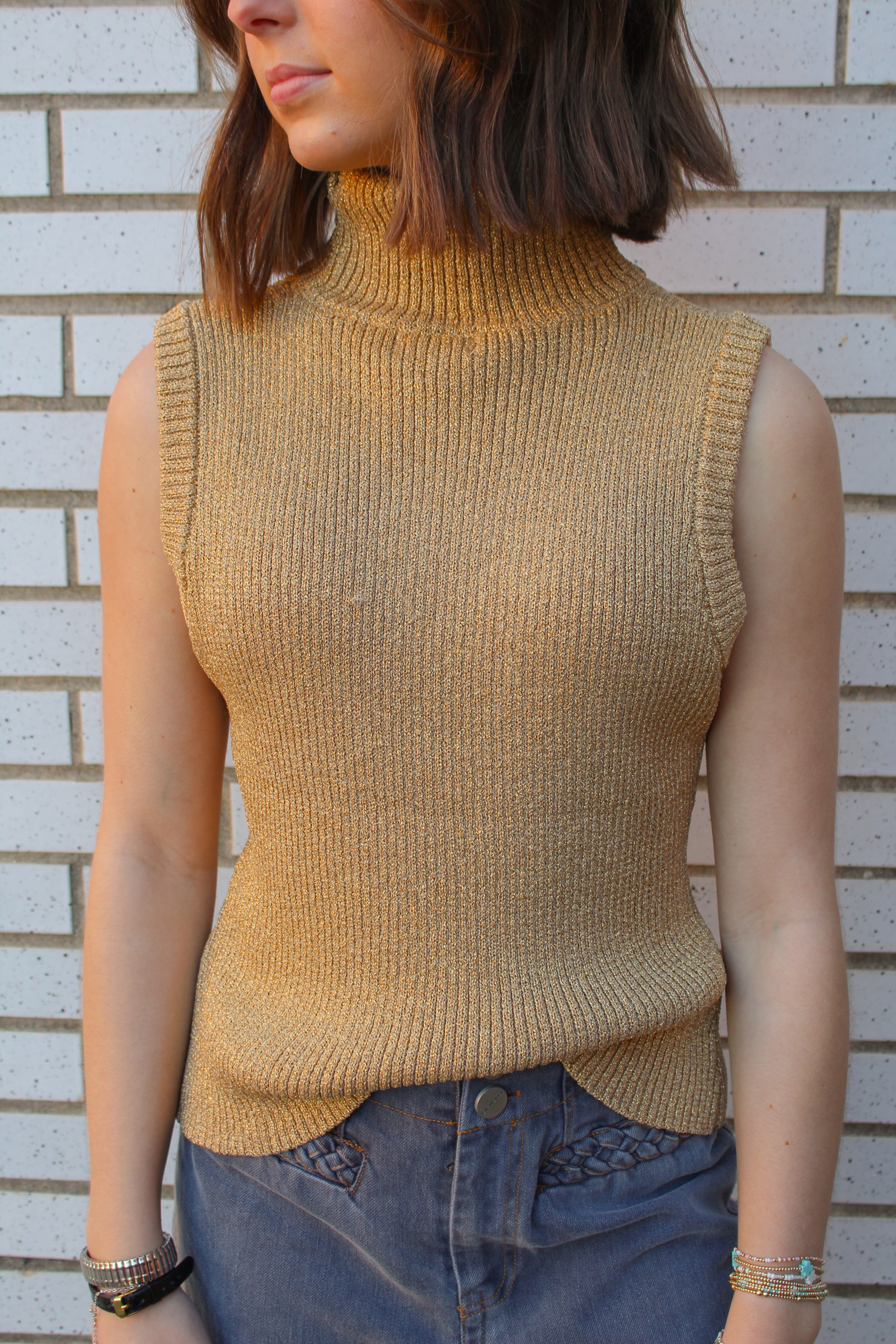 This sleeveless knit top features a cozy mock turtleneck and a fitted, ribbed texture. Designed in a rich gold tone with subtle metallic sheen, it brings an elevated touch to a simple silhouette.