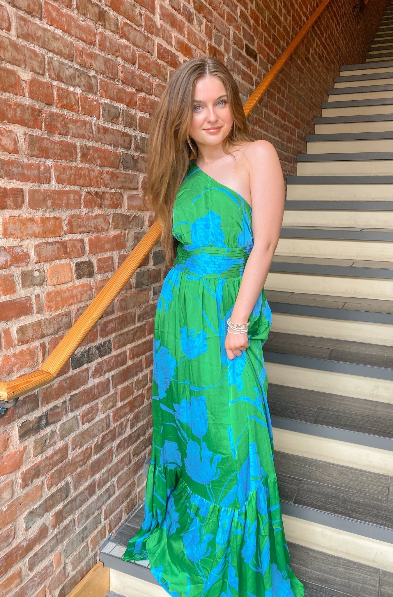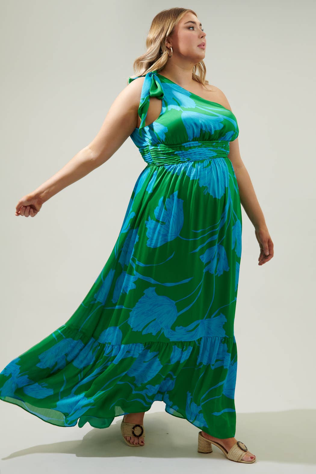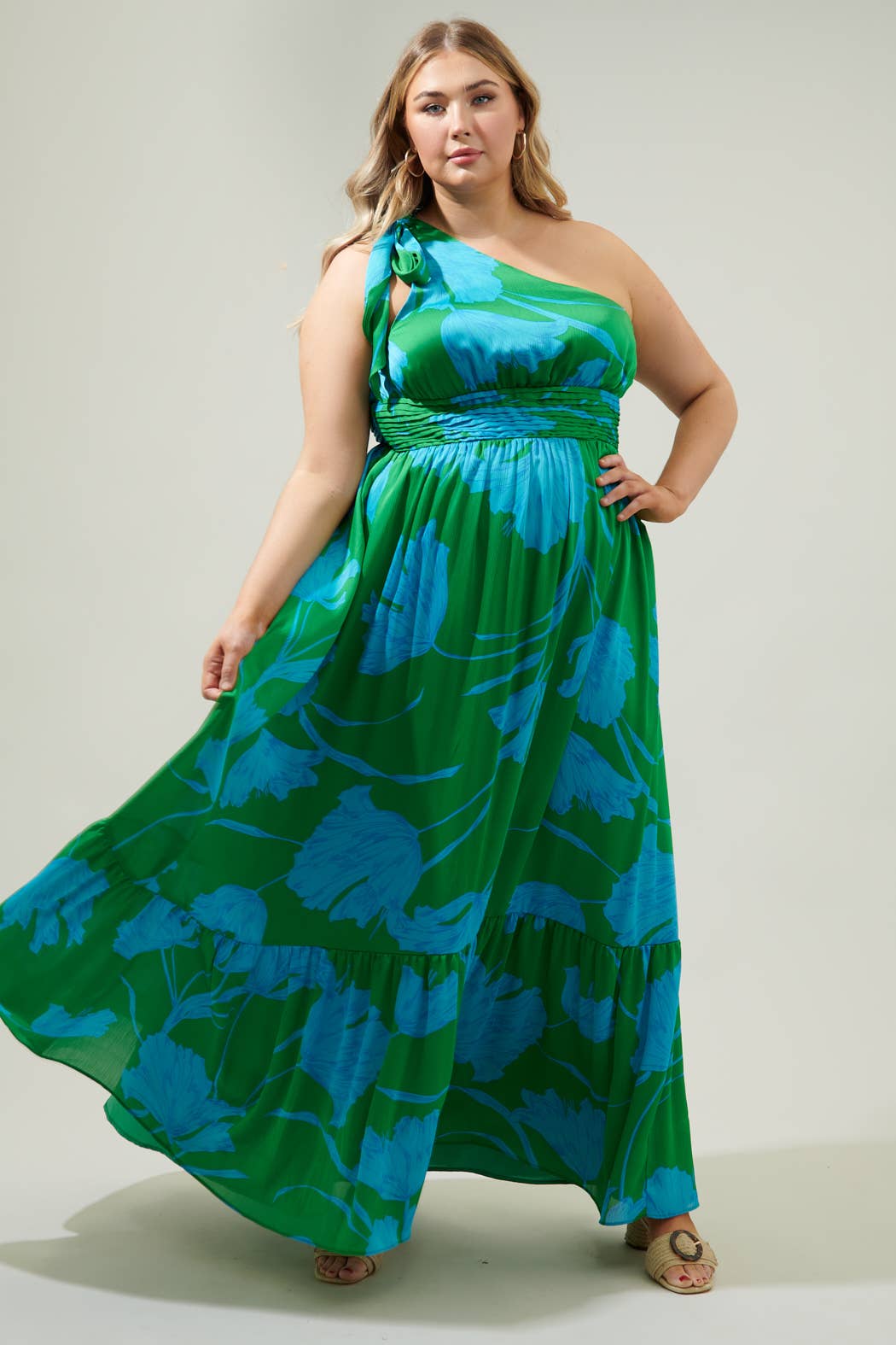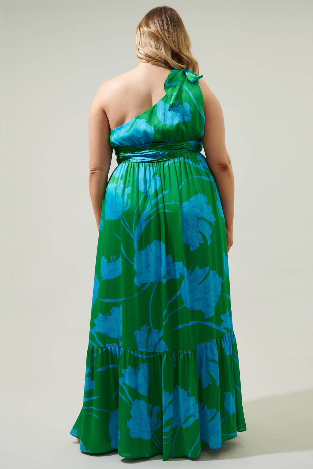 Plus one approved. This one shoulder maxi is going to be the talk of the summer. Sleek chiffon with a blue floral print decorates the Bayou Dress. A single shoulder with a tie detail sits atop the shoulder. A pleated band at the waist sits between a gathered bodice and single tier maxi skirt.
