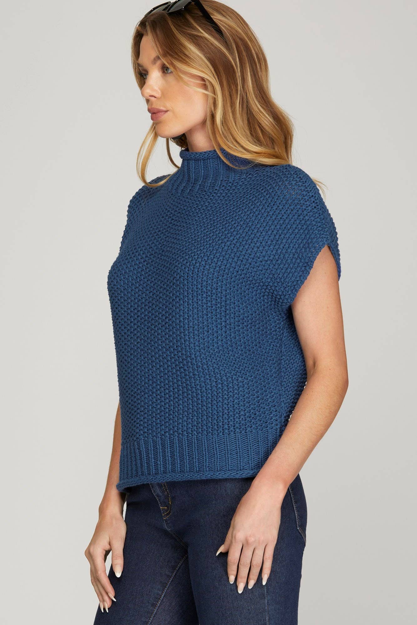 DUSTY BLUE DROP SHOULDER SLEEVELESS MOCK NECK KNIT SWEATER