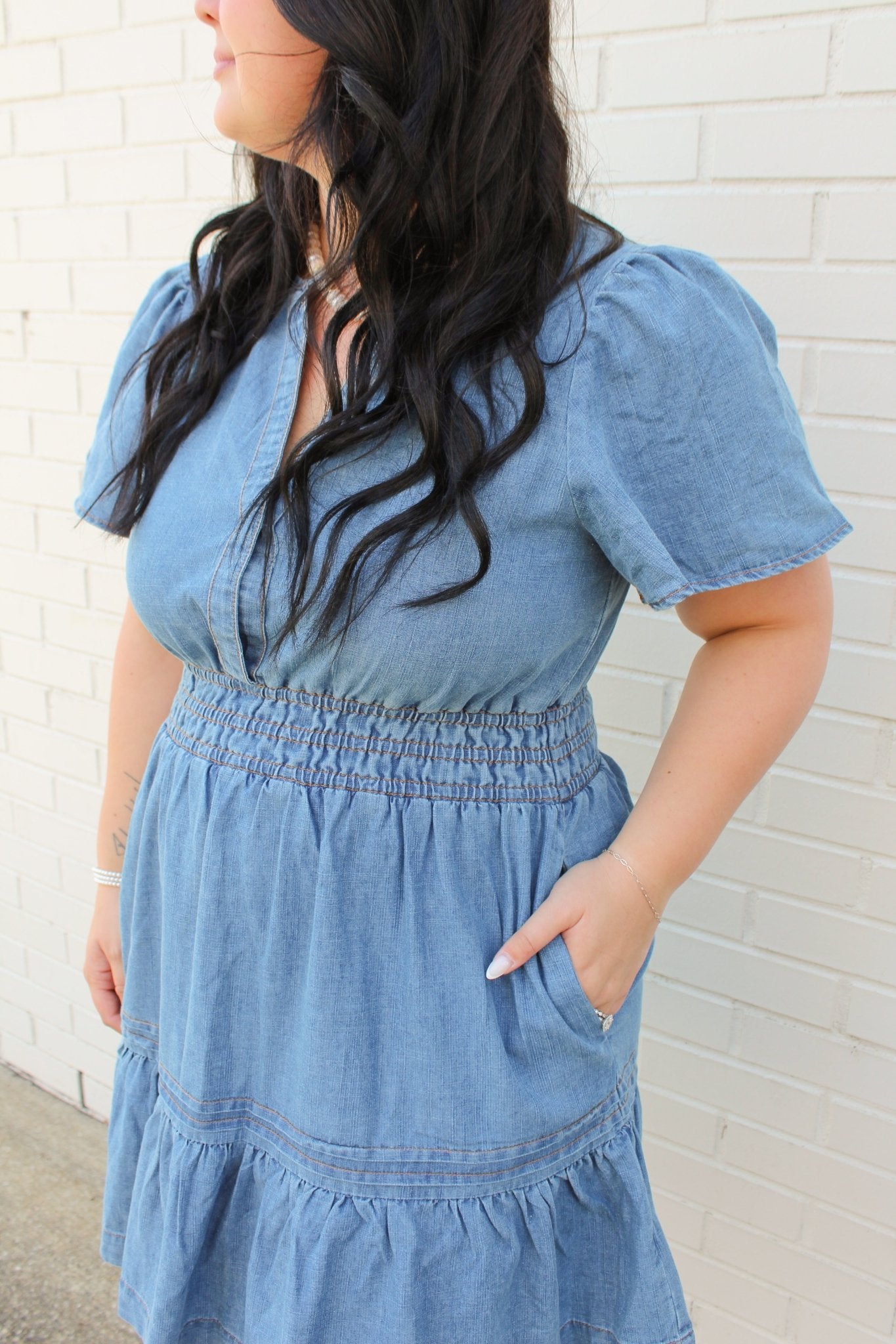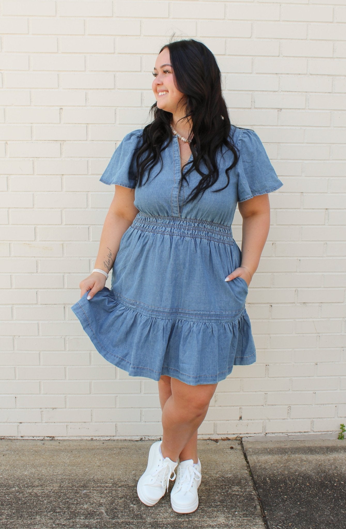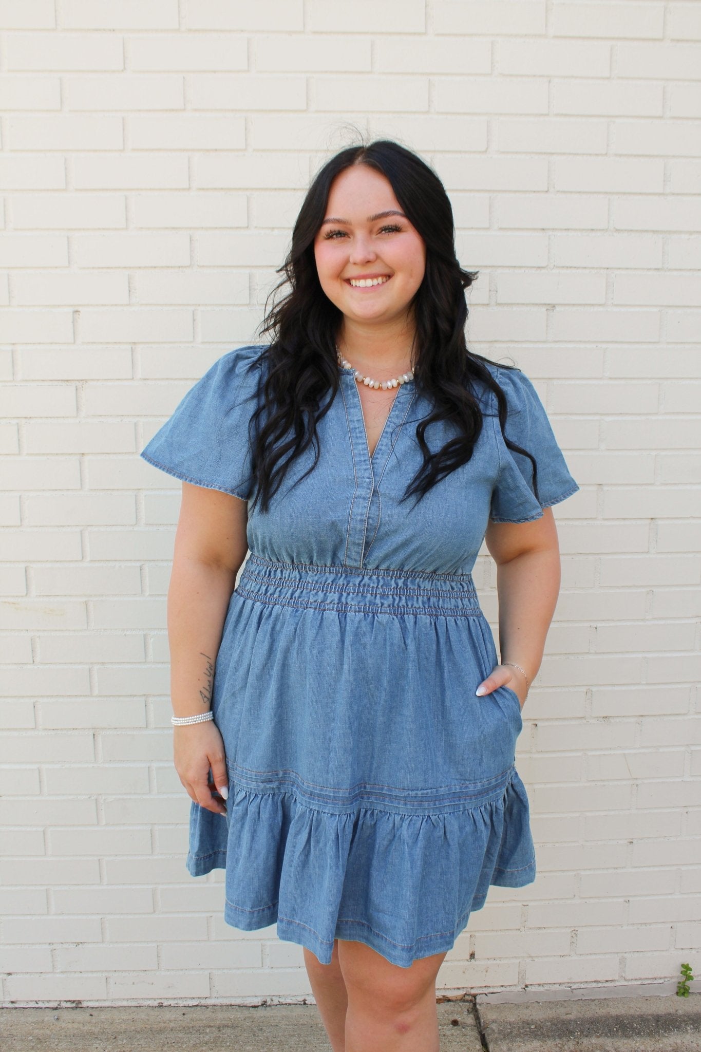This denim mini dress combines timeless style with contemporary details. The split neckline and delicate flutter sleeves create an elegant frame, while the elasticized waist defines your silhouette beautifully. Layered tiering adds movement and dimension to the skirt, making this piece versatile enough for casual outings or dressed-up occasions. Model wears size Small at 5'11" with a 31.5" bust, 23.5" waist, and 35" hips.