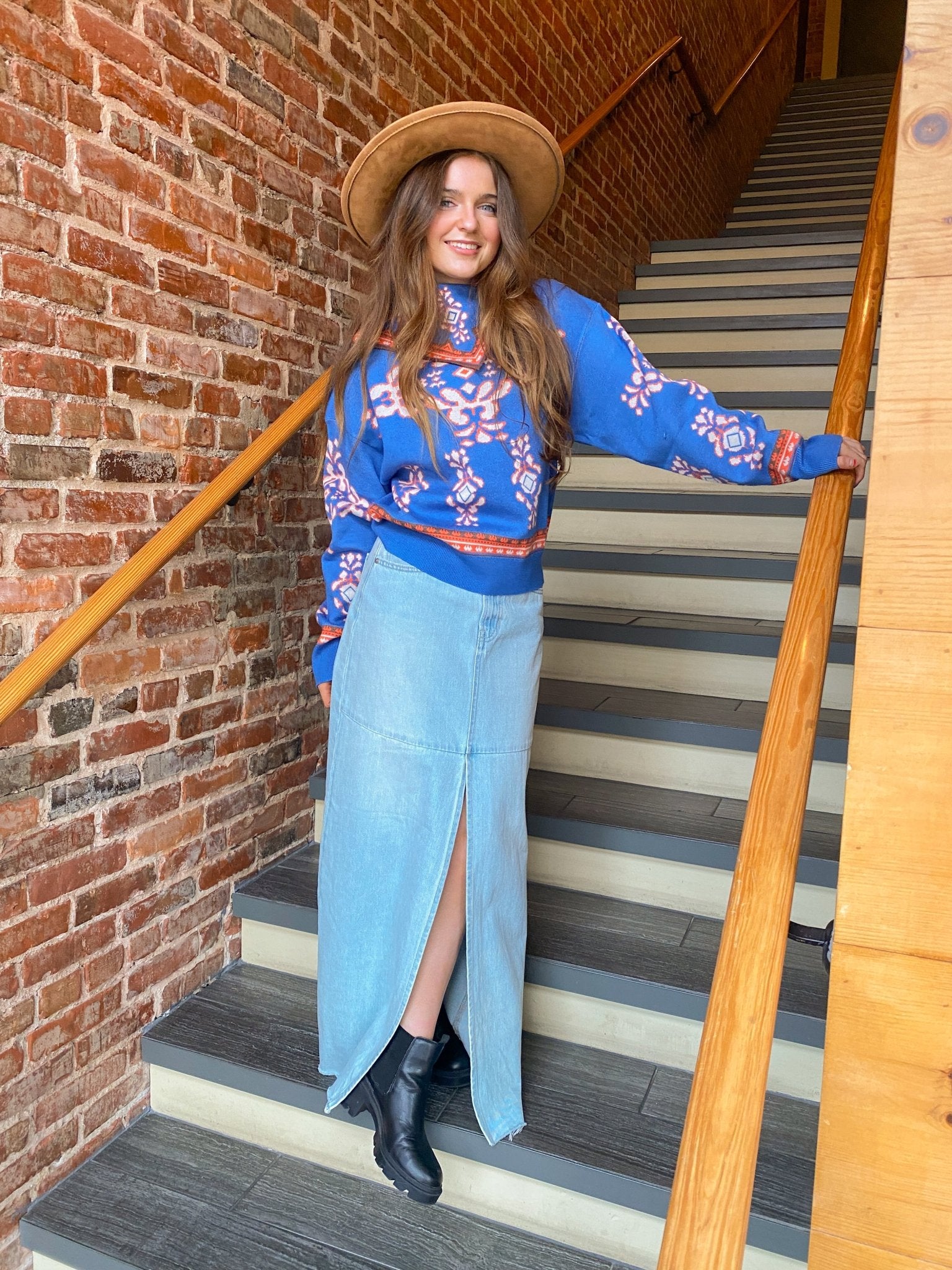 THML Blue and Orange Scarf Neck Print Long Sleeve Sweater