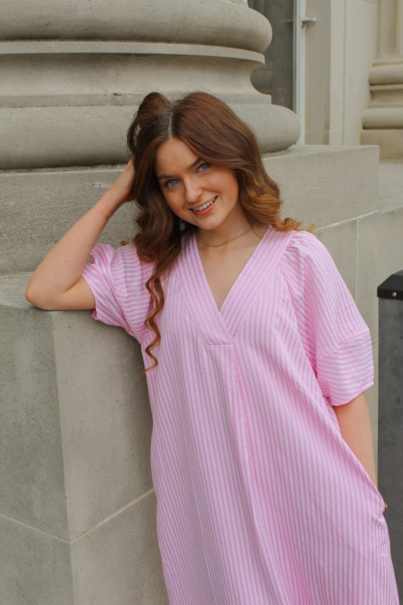 Elevate your wardrobe with this refined striped midi dress, showcasing a striking contrast between deep and pale pink tones. The textured woven fabric drapes beautifully with distinctive raglan lantern sleeves and subtle side slits for movement. Practical side pockets and a lined construction ensure comfort and functionality, while the non-sheer, lightweight polyester makes it ideal for layering or wearing solo. A timeless piece that transitions effortlessly from day to evening.
