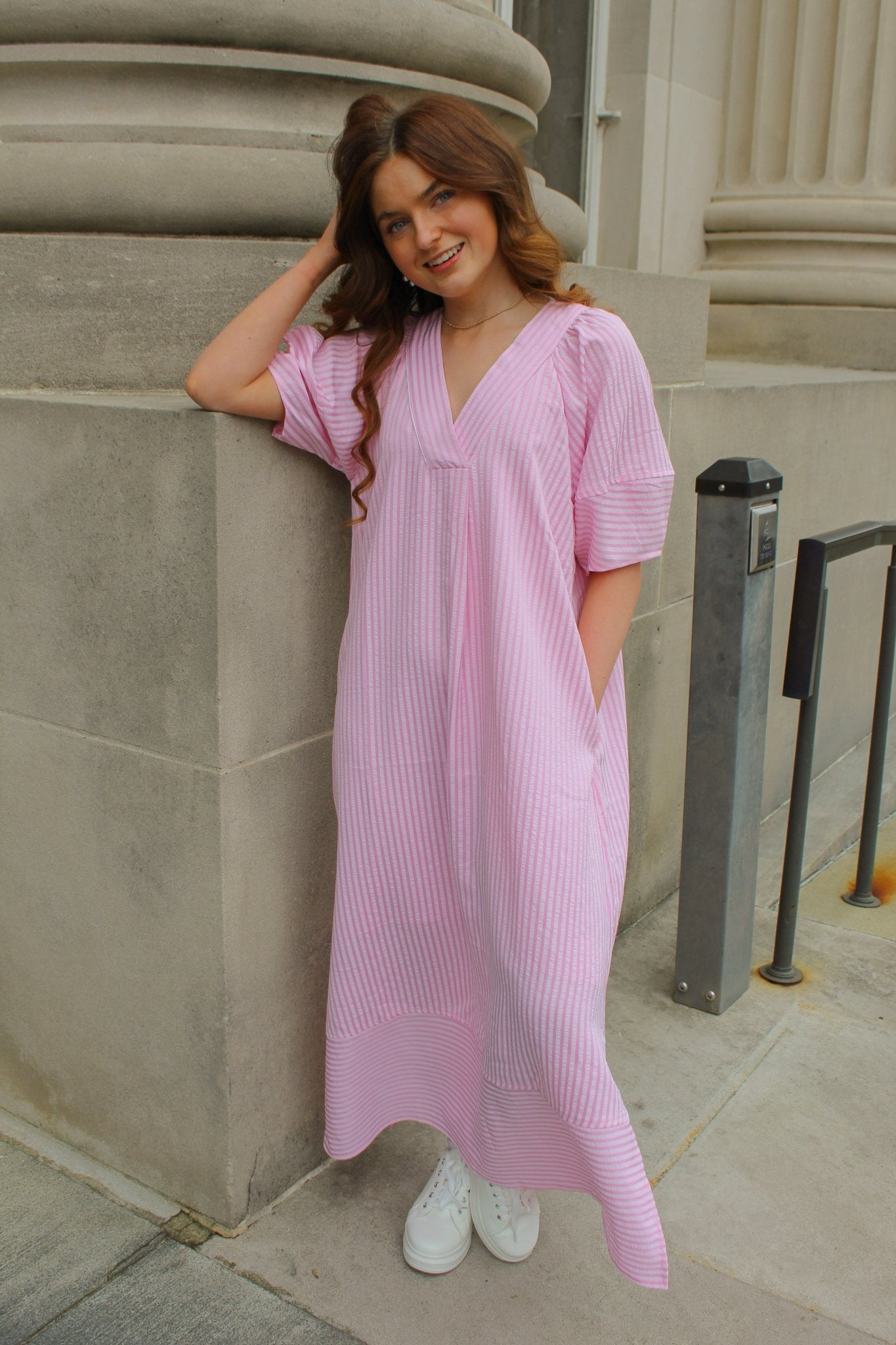 Pink and Light Pink Contrast Striped V-Neck Short Sleeve Maxi Dress
