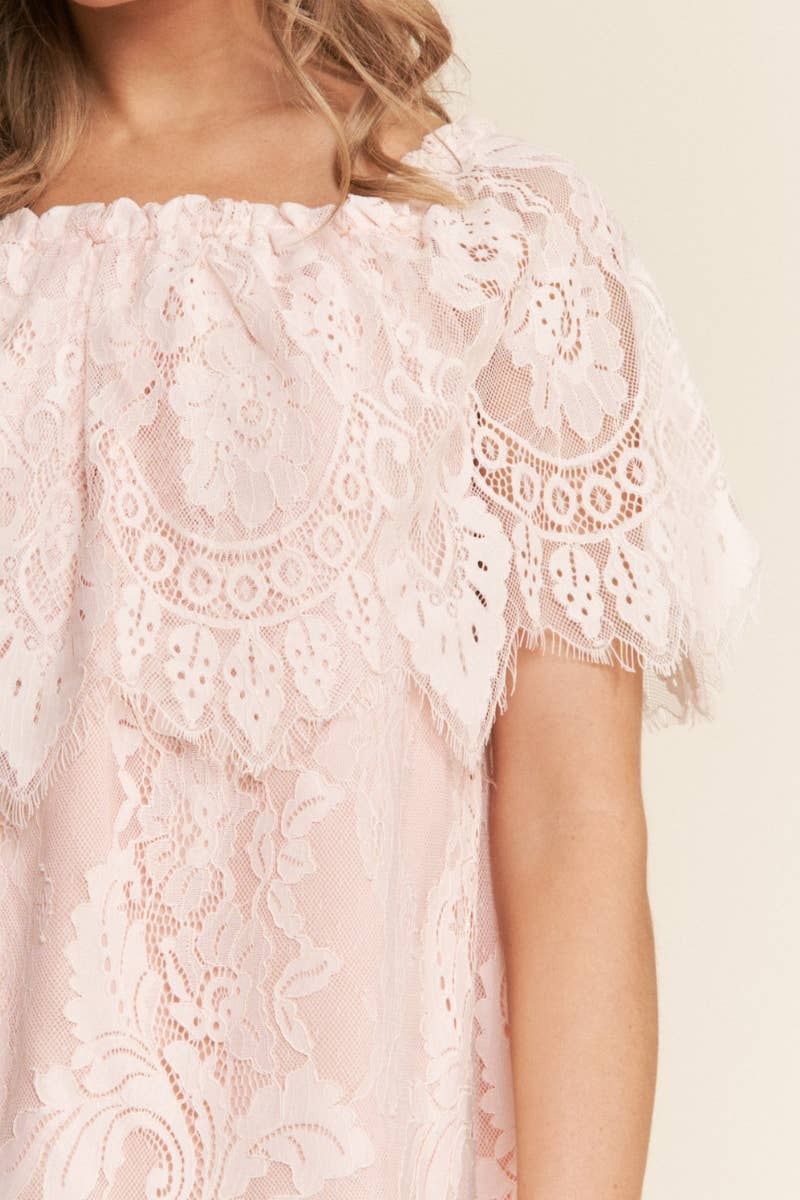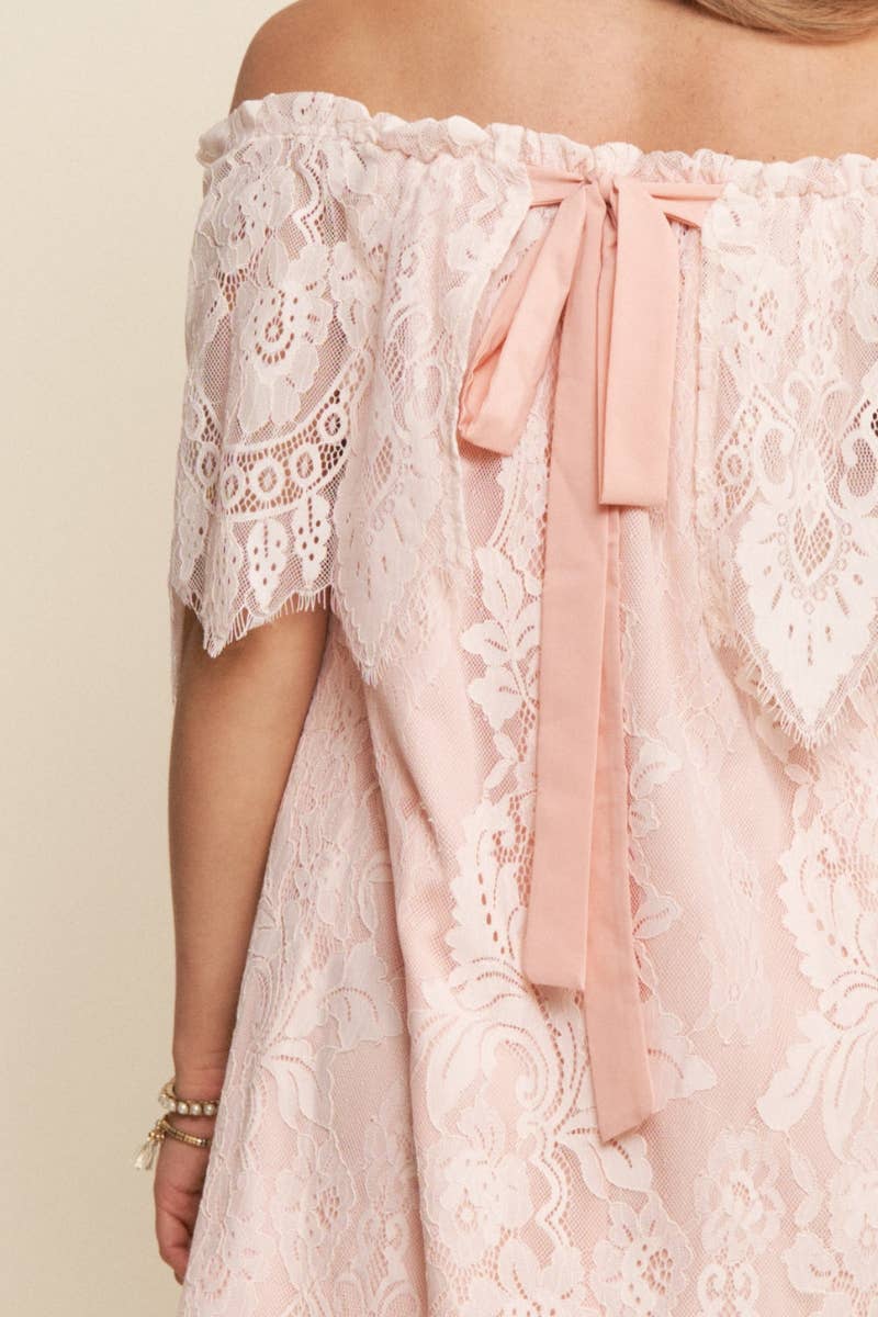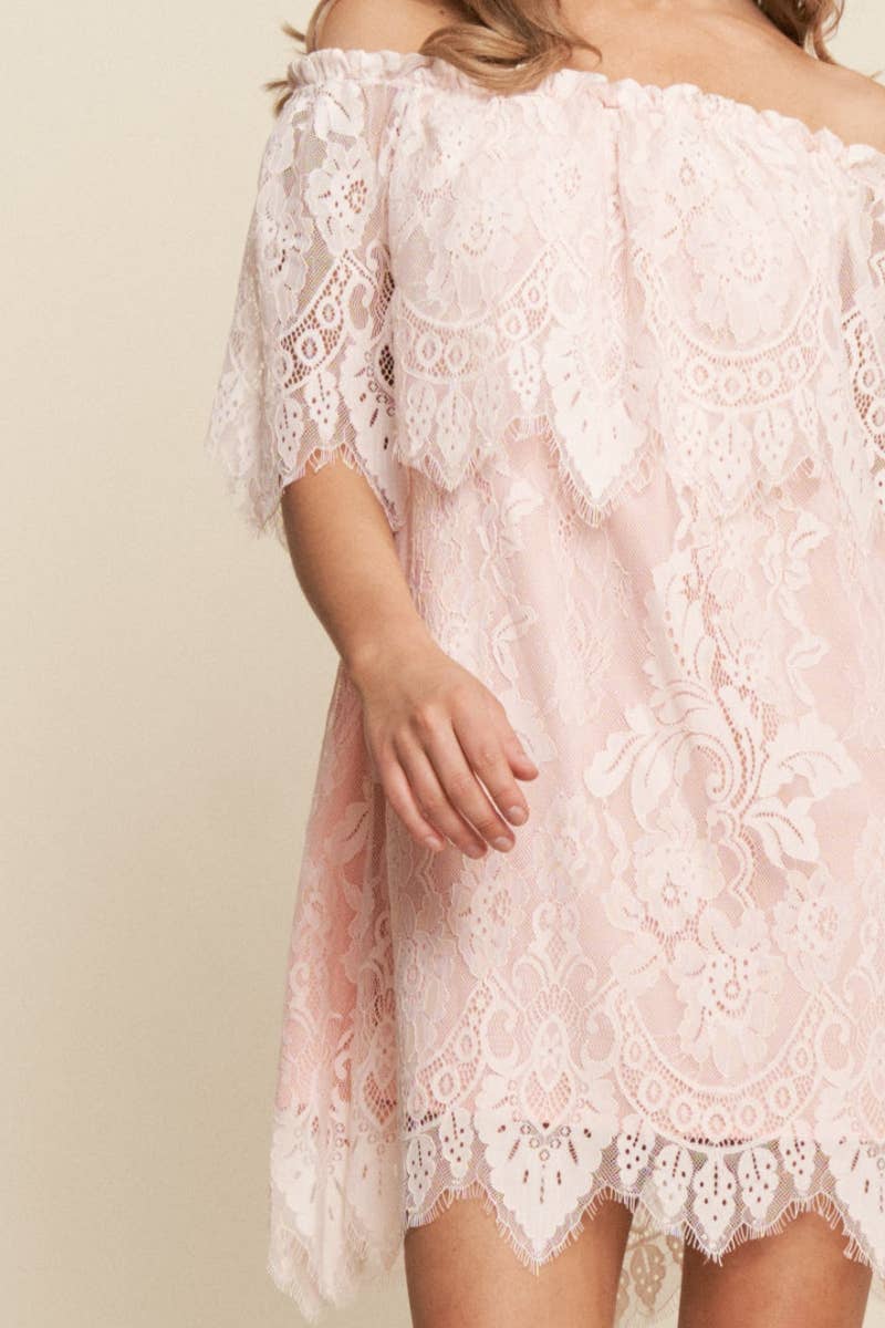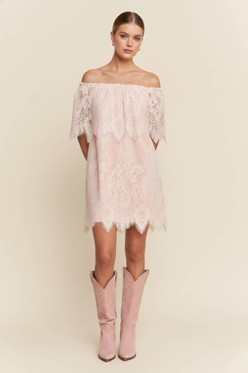 Pink Dream laced off-shoulder mini dress. This striking piece, with an off-shoulder design and exquisite lace detailing, is lined for added coverage, ensuring a flawless fit. Perfect for any occasion.