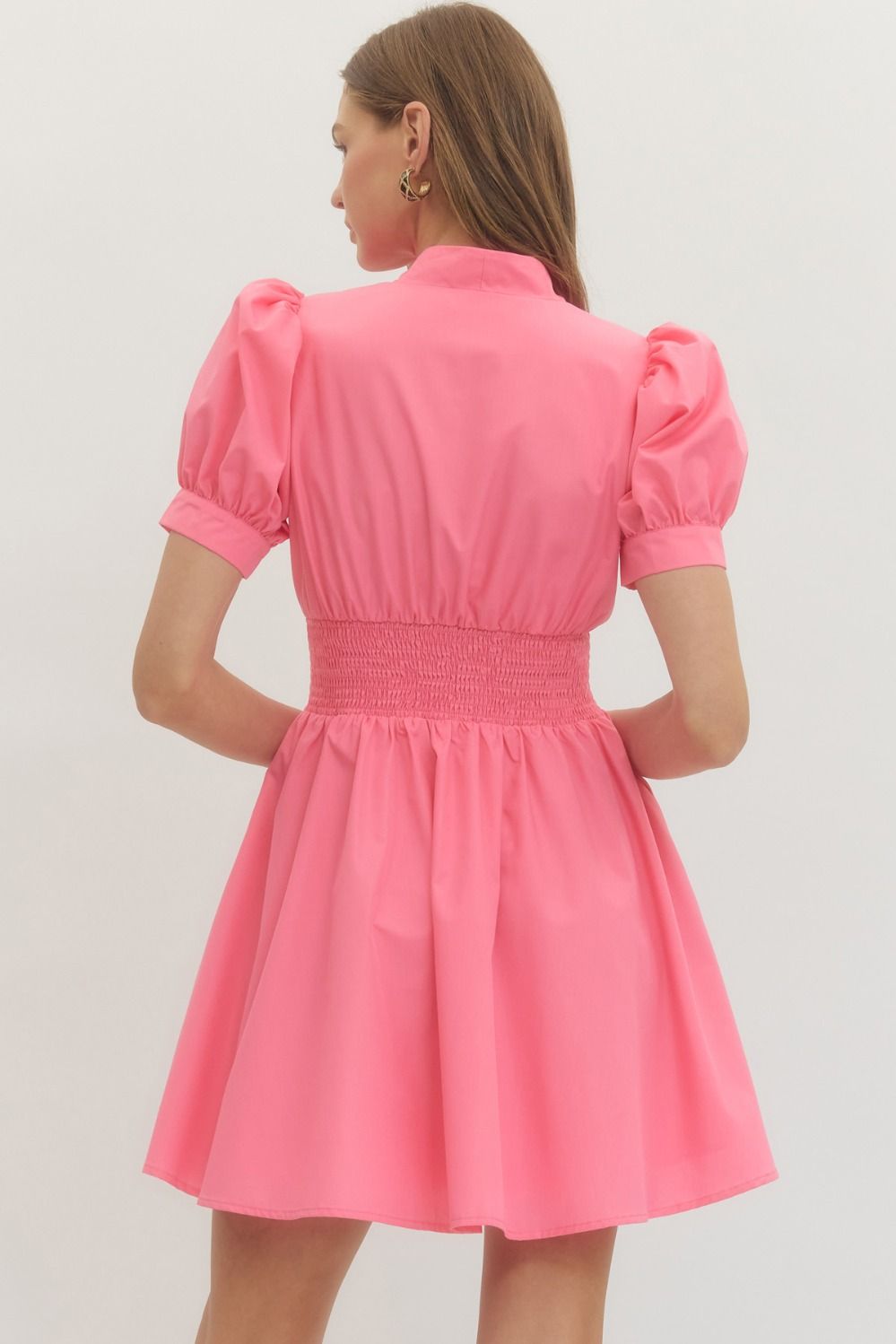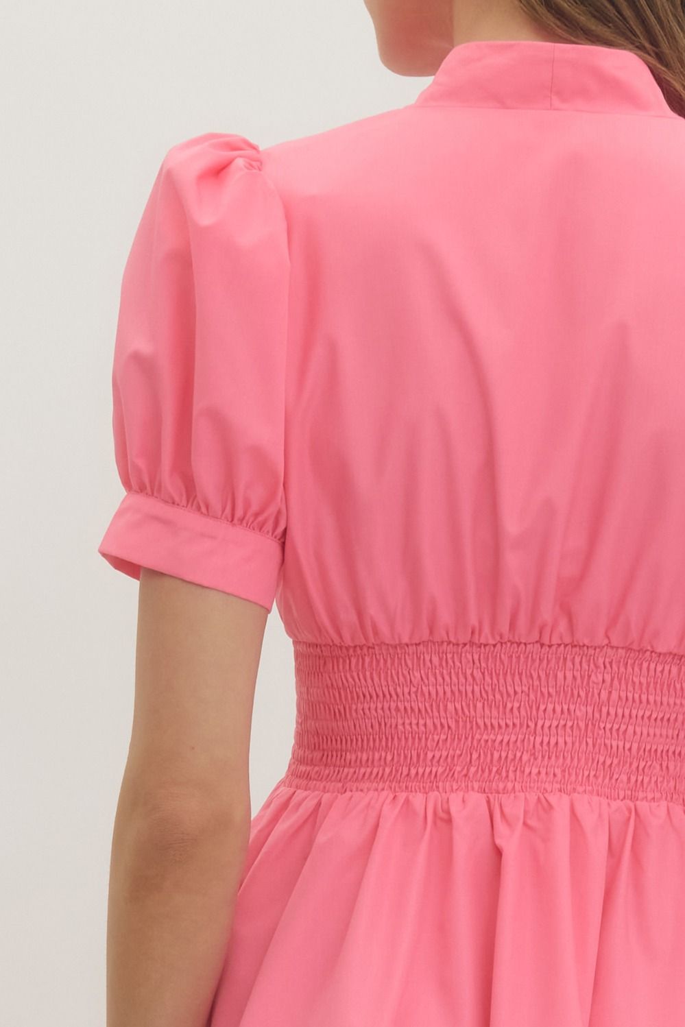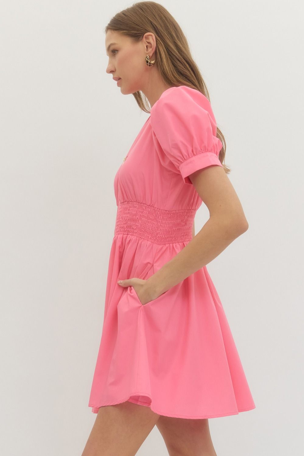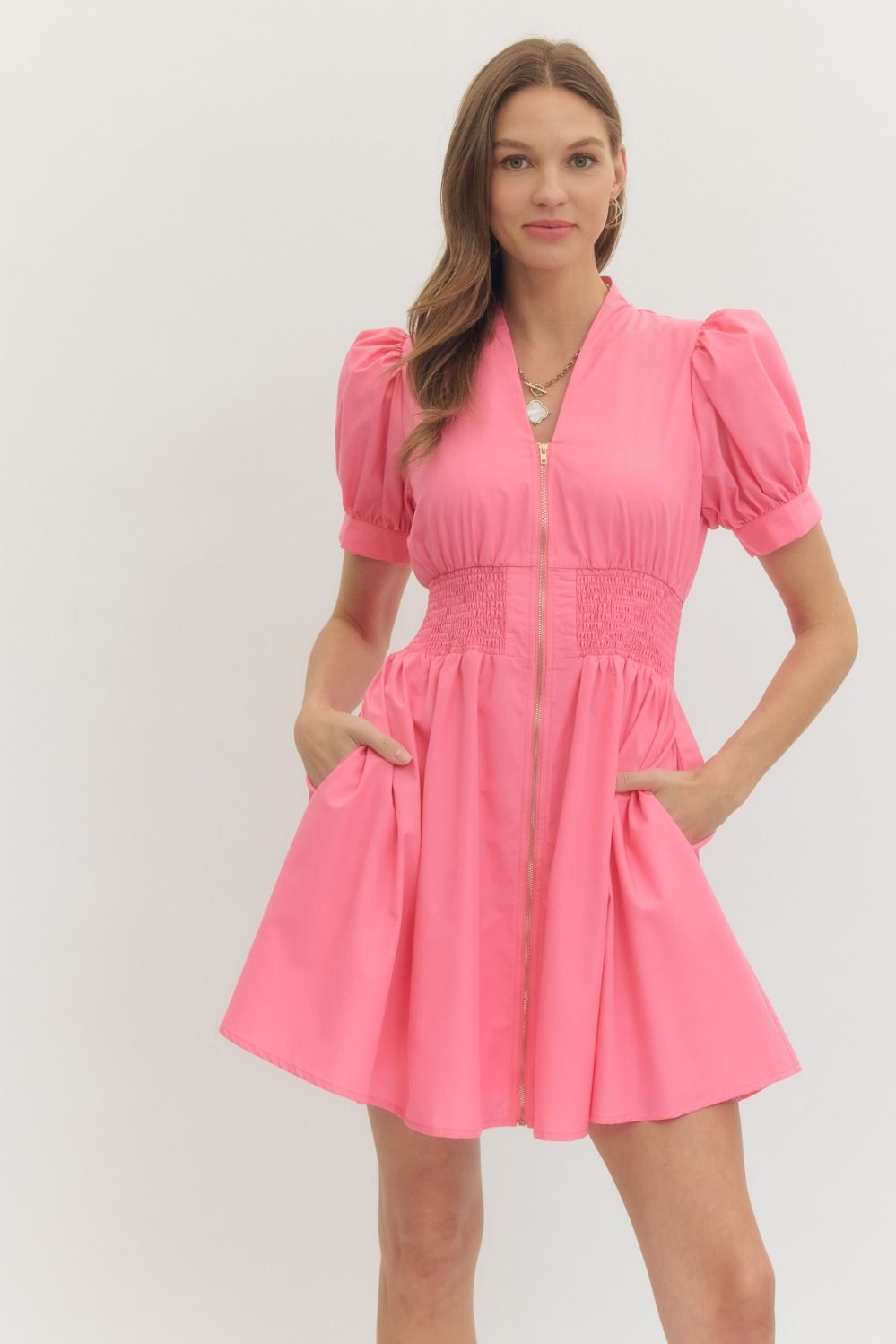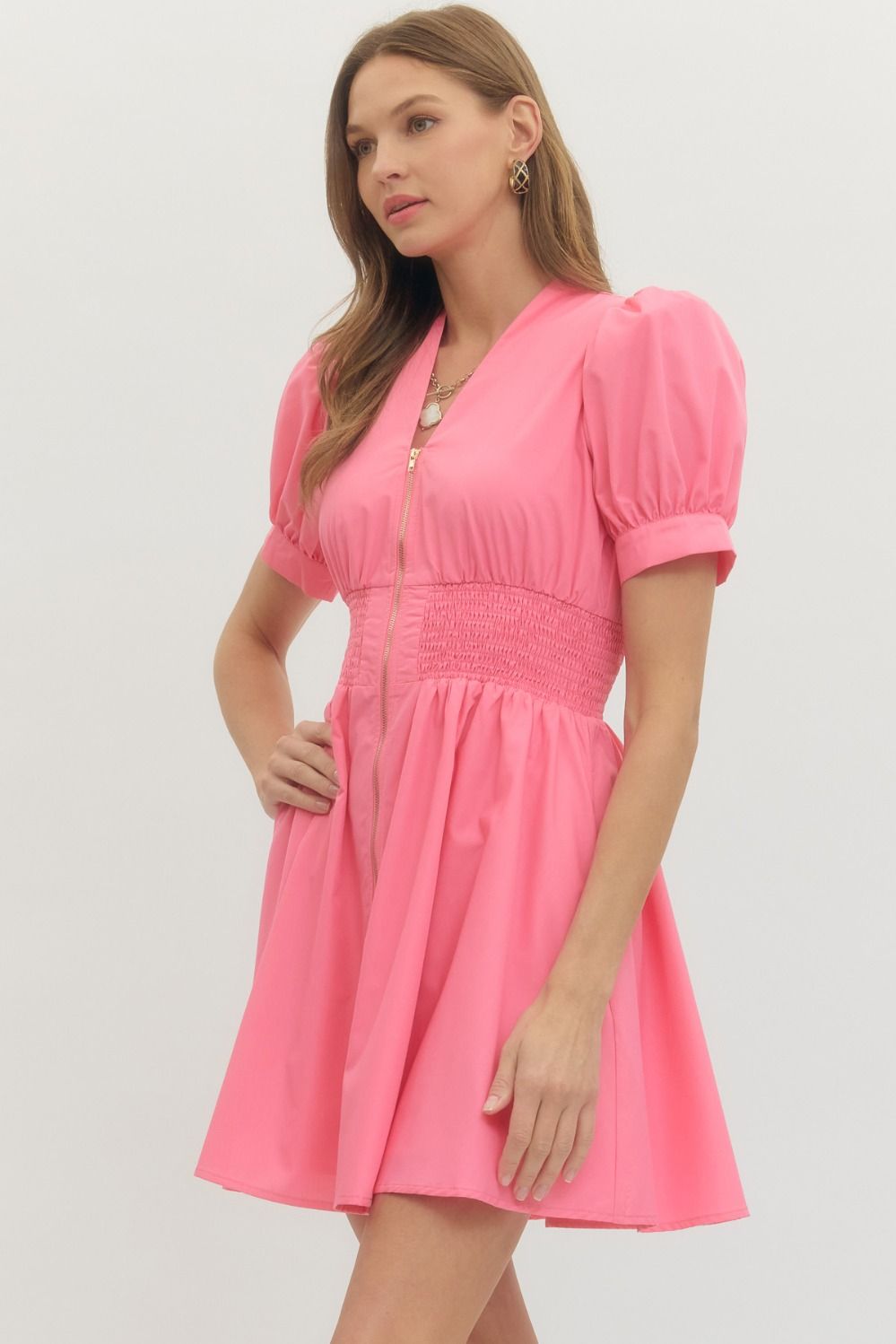 A refined mini dress in soft pink that balances feminine details with understated elegance. The voluminous puff sleeves and plunging V-neckline create visual interest, while the smocked waist provides gentle shaping. Practical side pockets and a front-zip closure enhance wearability without compromising style. The fully lined, non-sheer construction in a lightweight polyester-cotton blend ensures comfort and confidence. An versatile piece for both polished casual and semi-formal occasions.