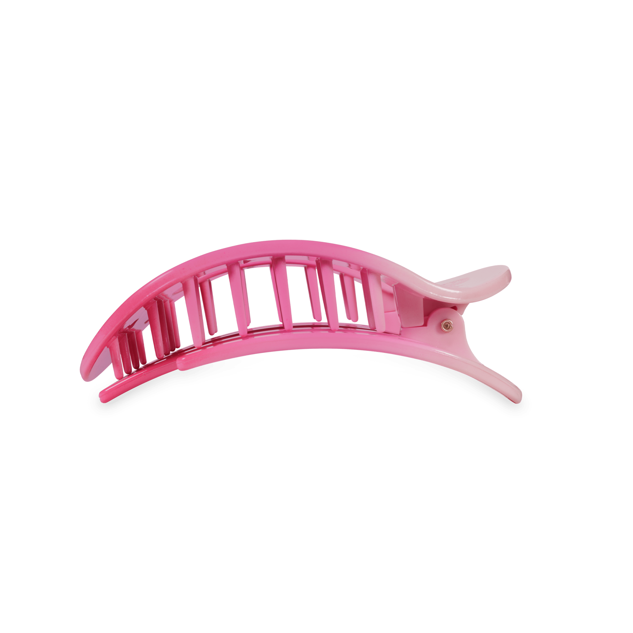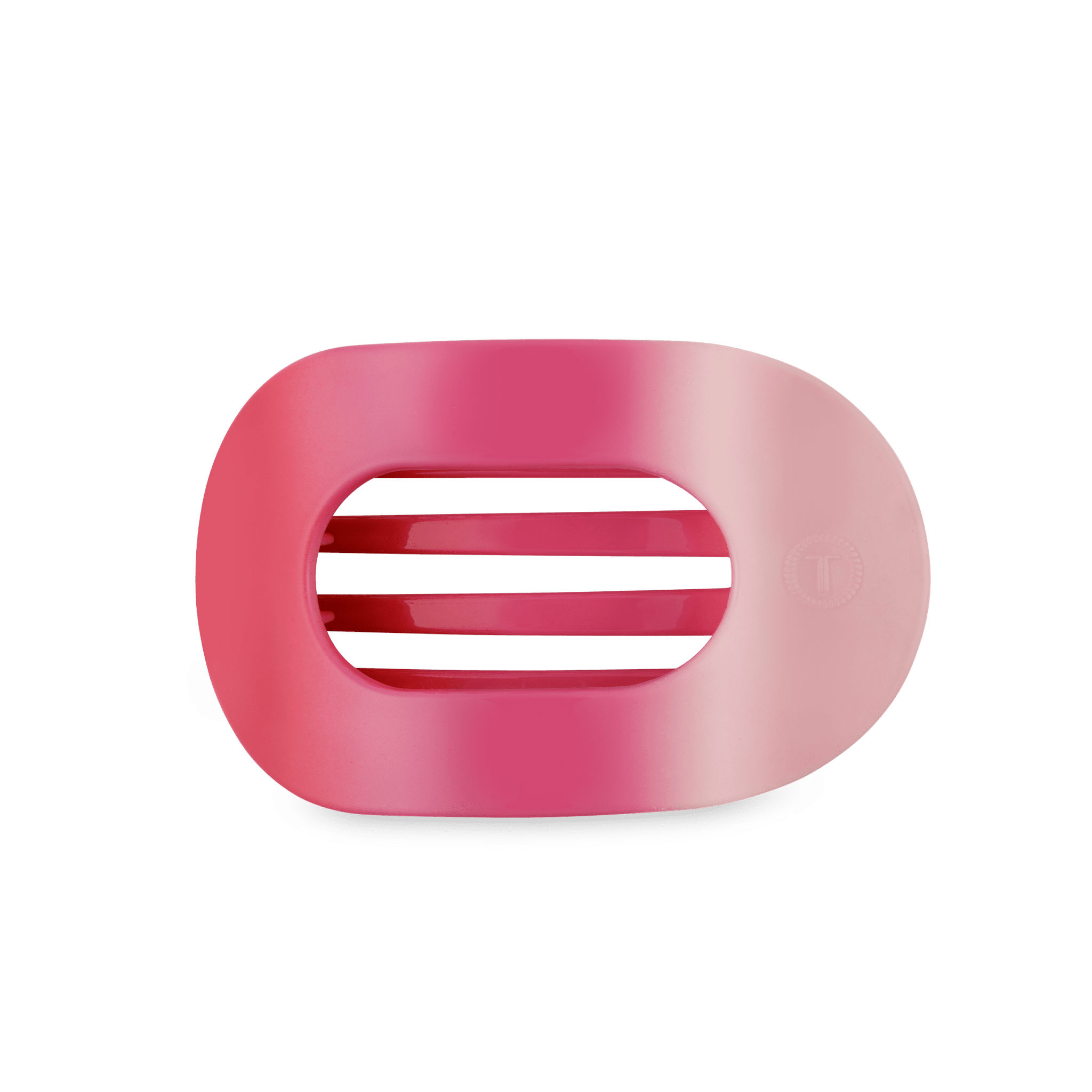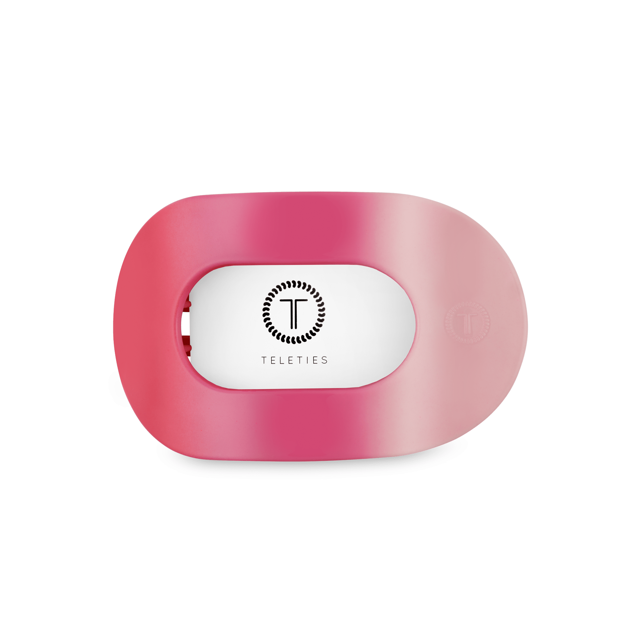 Lay flat and relax with the new TELETIES Kiss & Tell Medium Flat Round Hair Clip in Pink. Hand-sprayed for a one-of-a-kind pink and red ombré—expect slight variations in each clip. This hair clip is designed to allow you to lay back flat, do yoga, or sit comfortably in a seat with a headrest, and it is made with the same material that is nearly unbreakable.