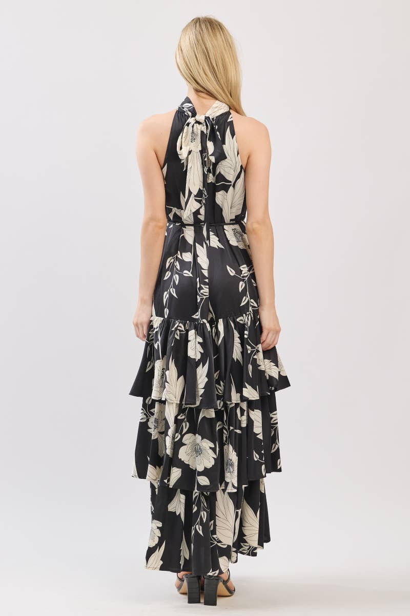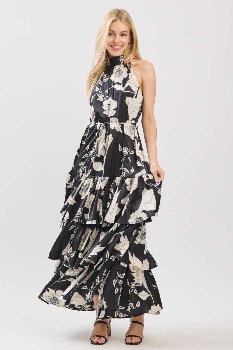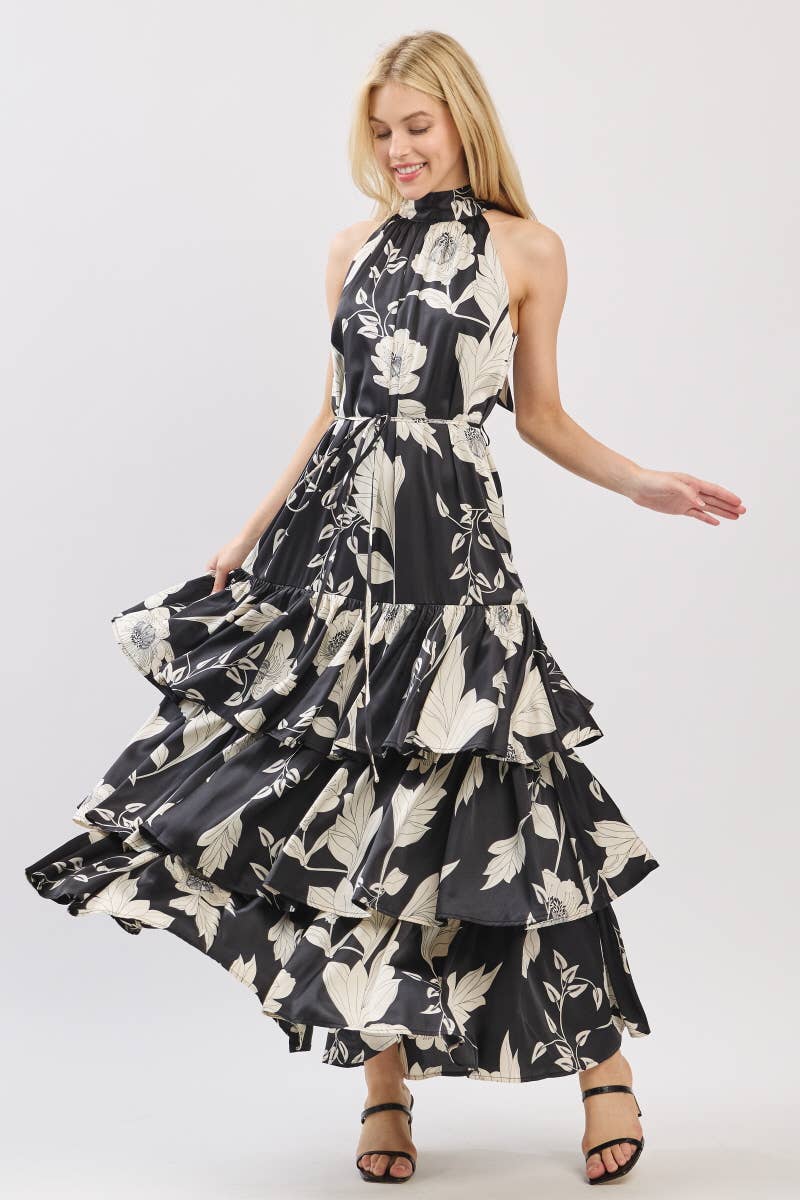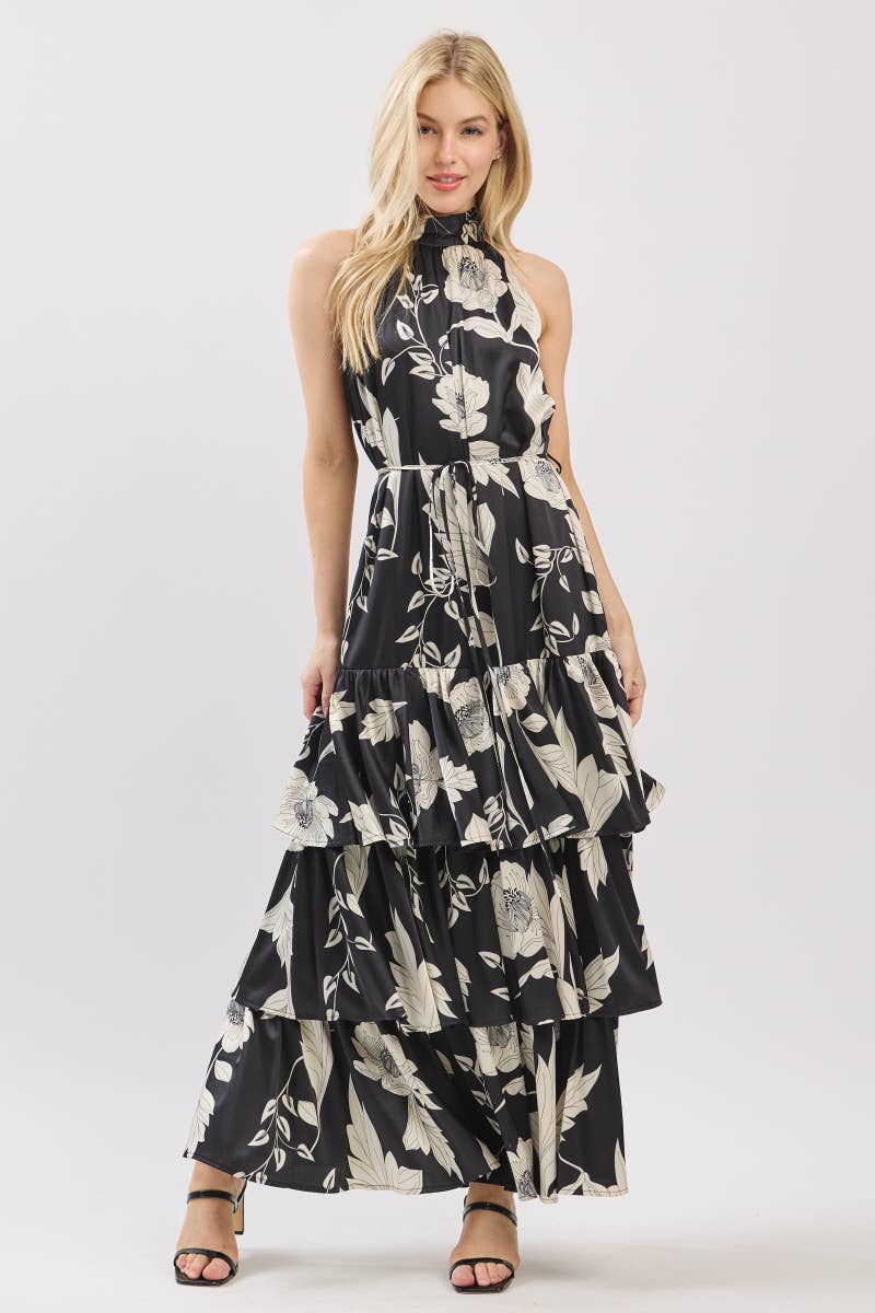 Black and Ivory Floral Satin Mock Halter Neck Tiered Maxi Dress