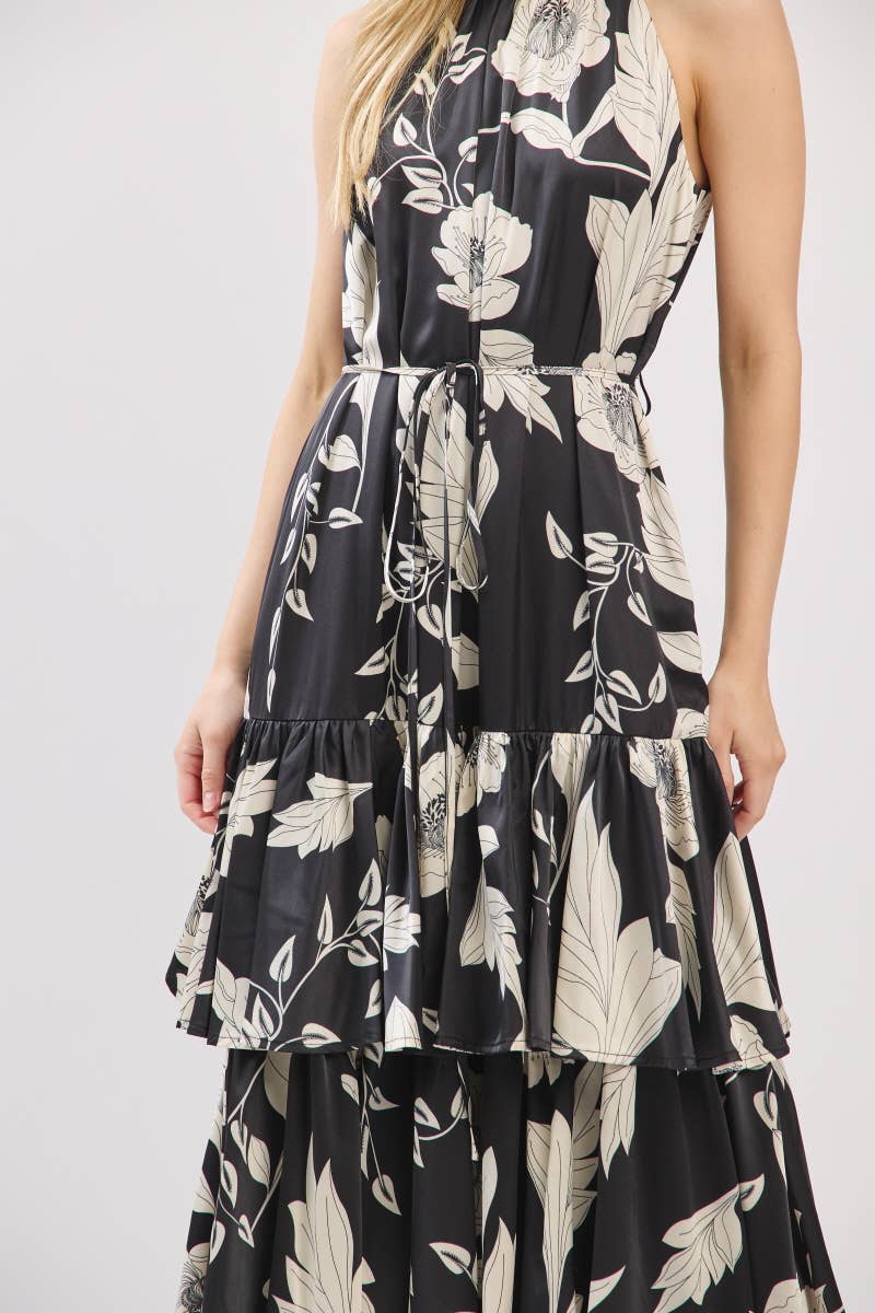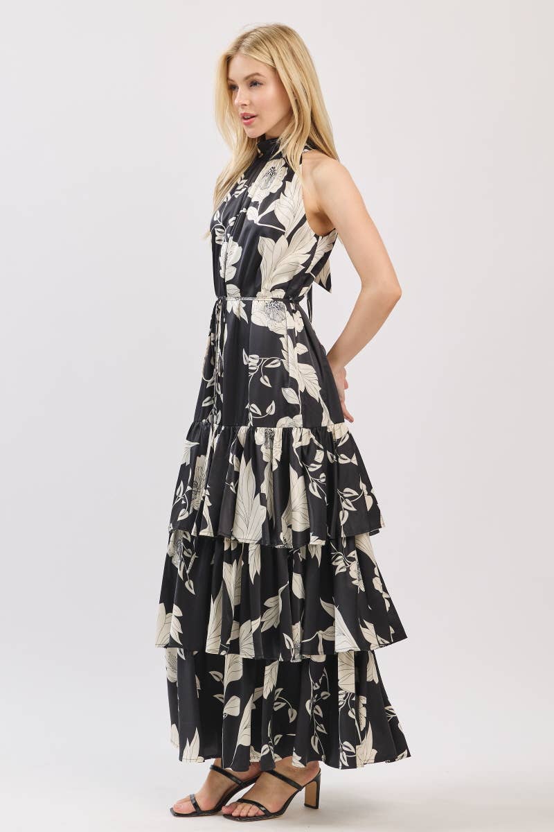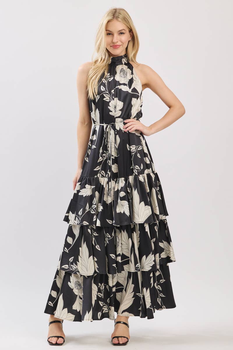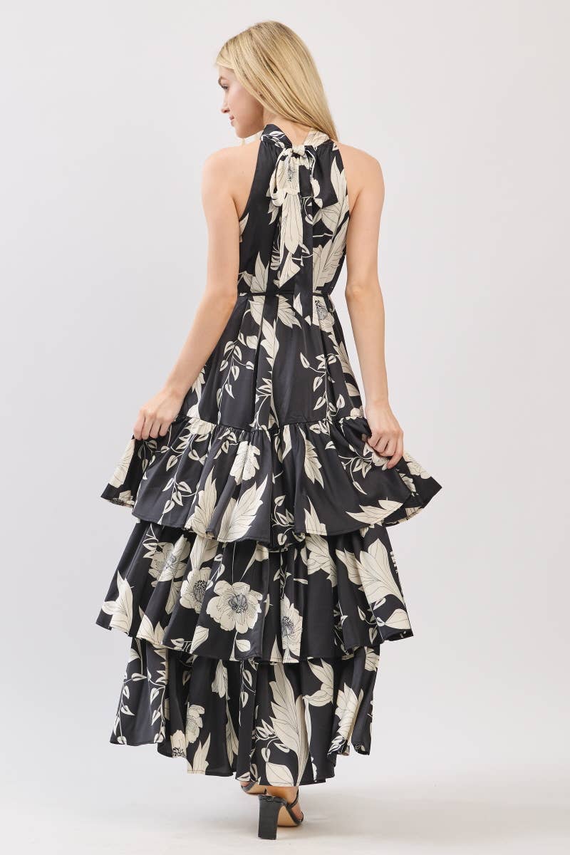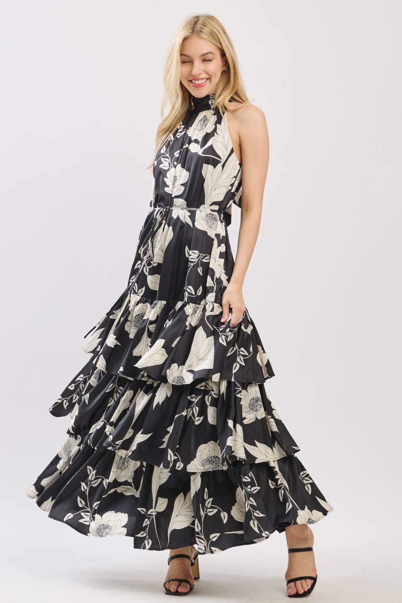Black and Ivory Floral Satin Mock Halter Neck Tiered Maxi Dress