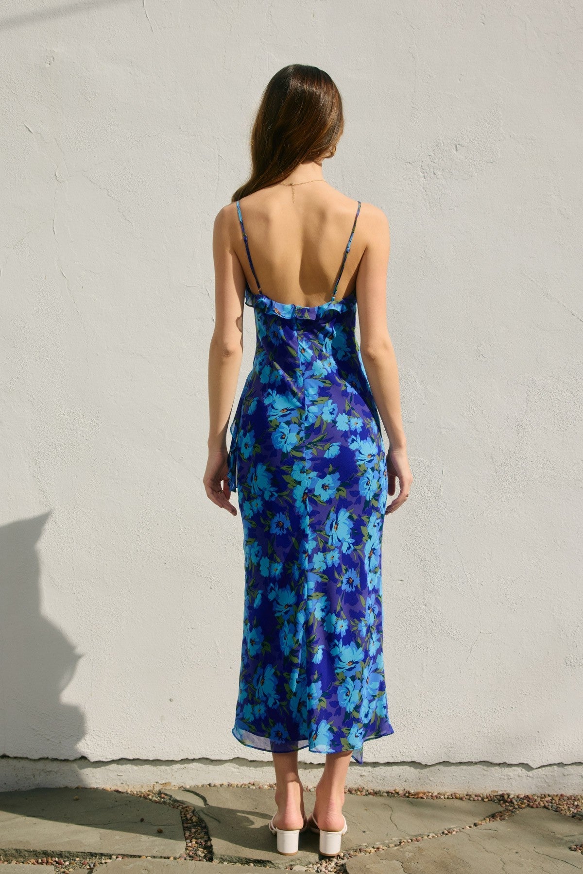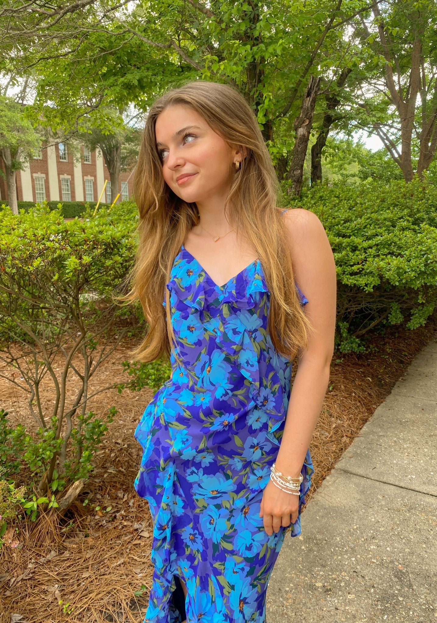 Floral printed sleeveless maxi dress. Model is 5'9" and wearing size Small. - Ruffled detail - V neck - Spaghetti straps. Created for effortless luxury, a timeless choice for style-forward looks.