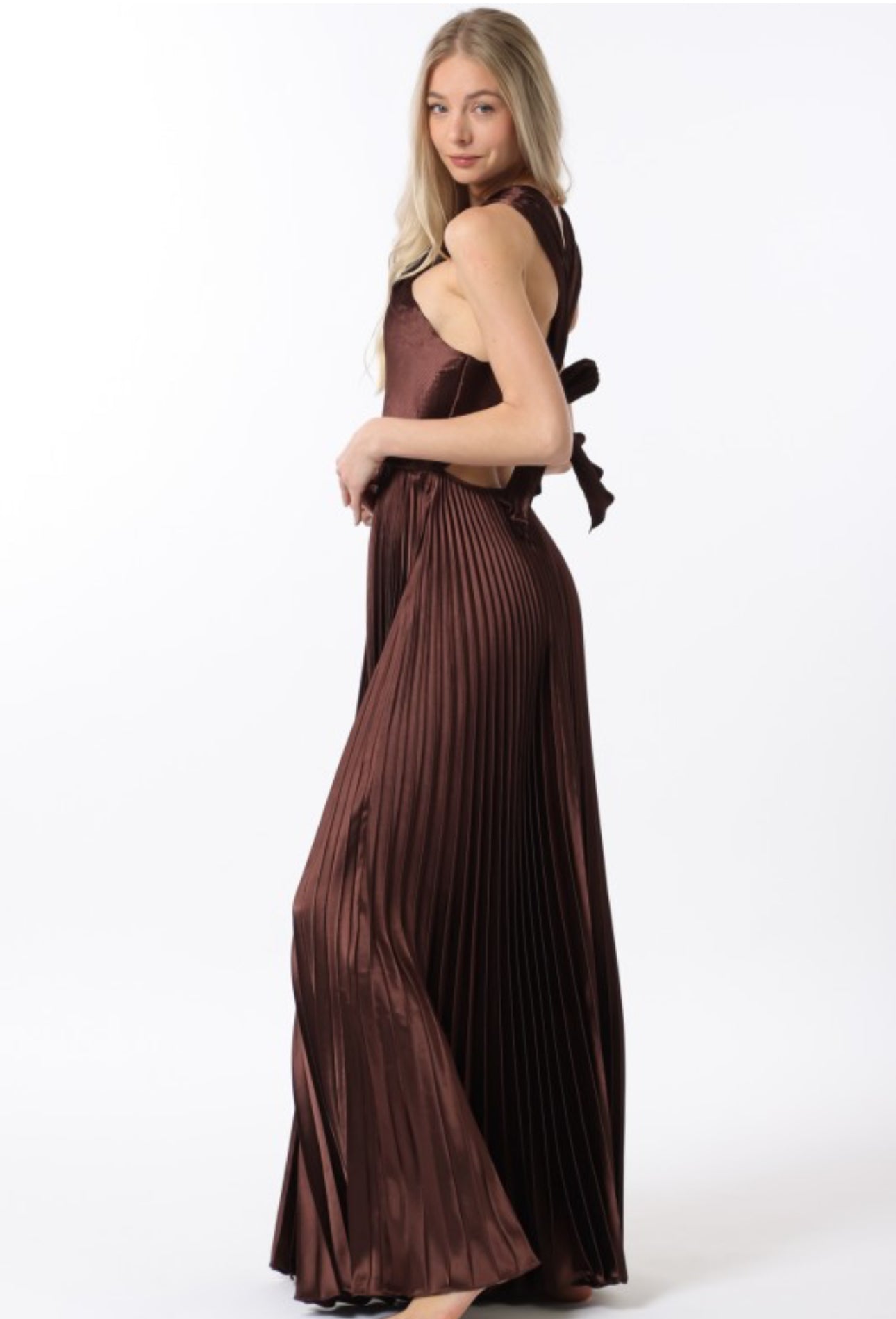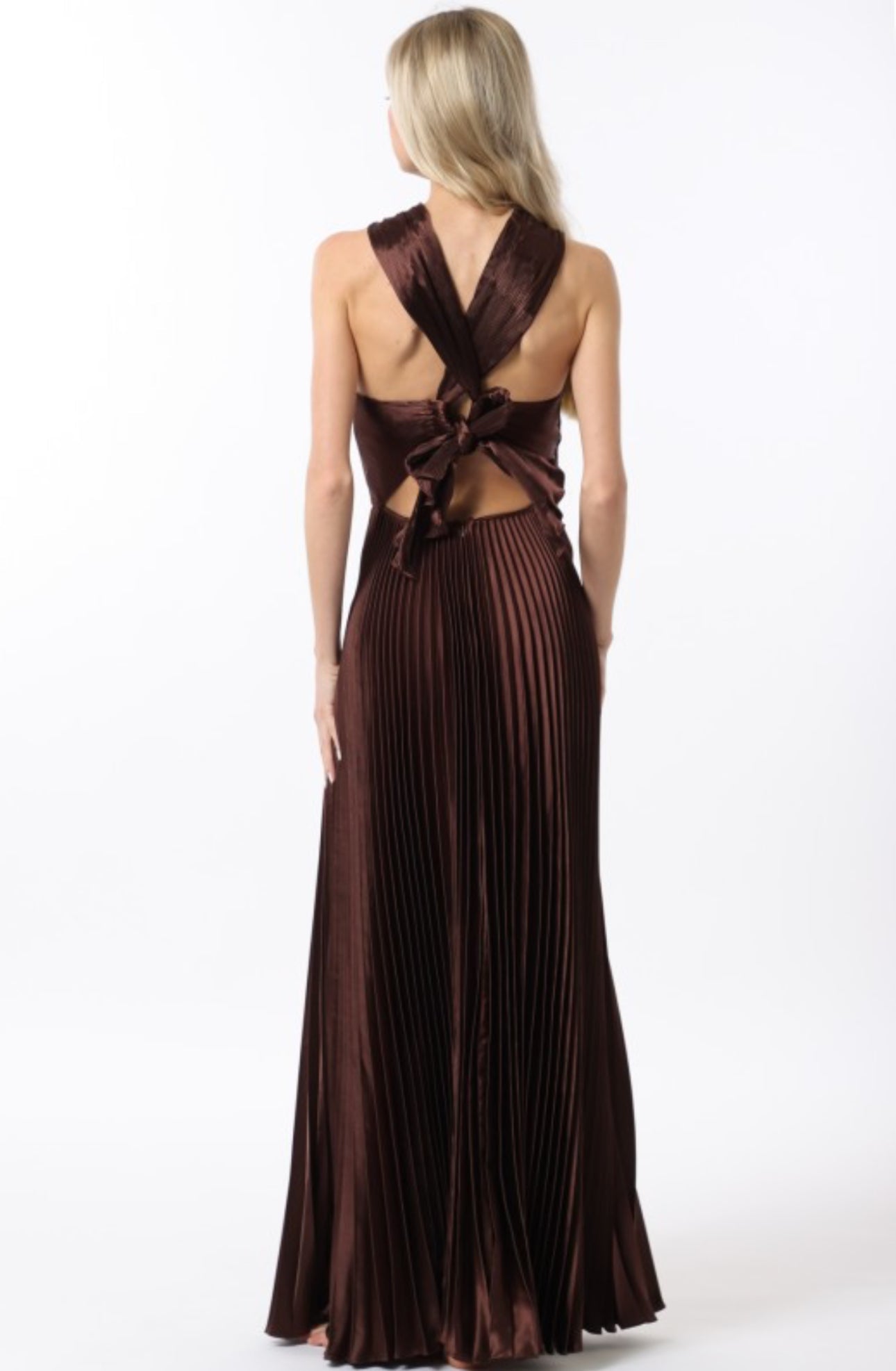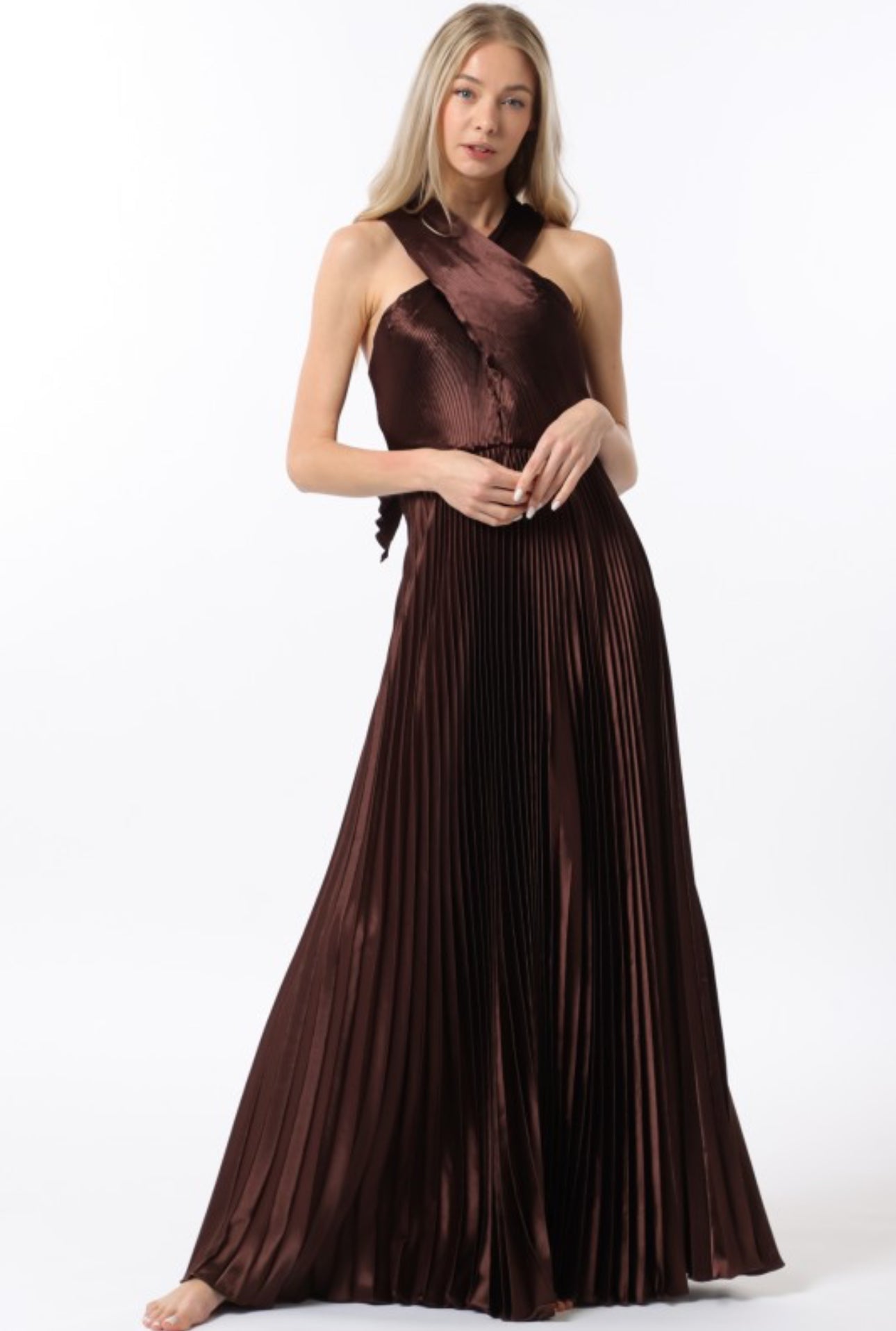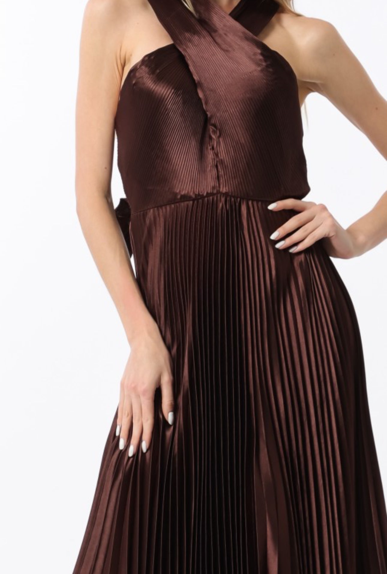 Chocolate Brown Satin Cross Neck Tie Back Pleated Maxi Dress
