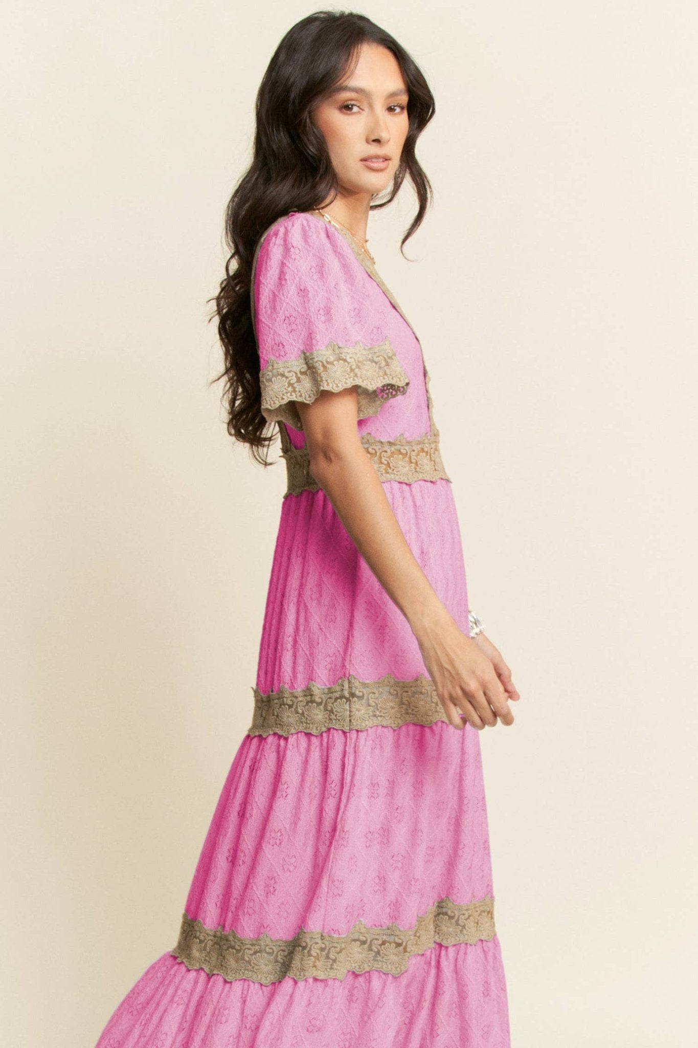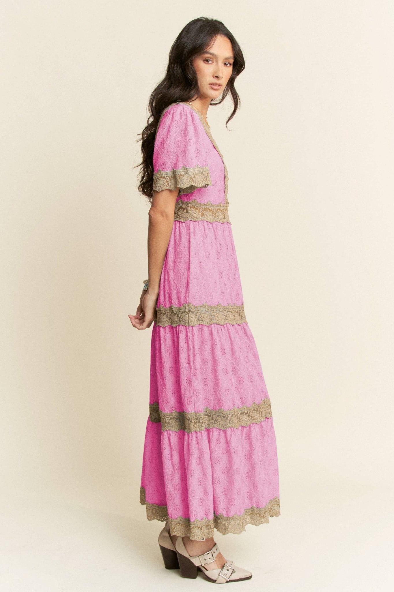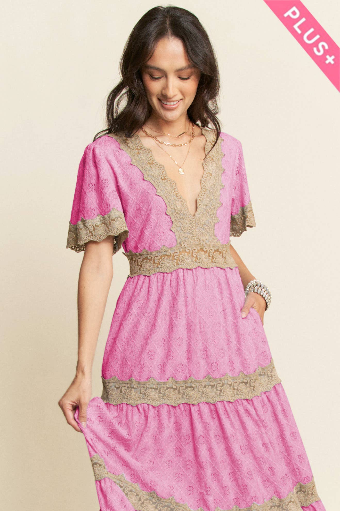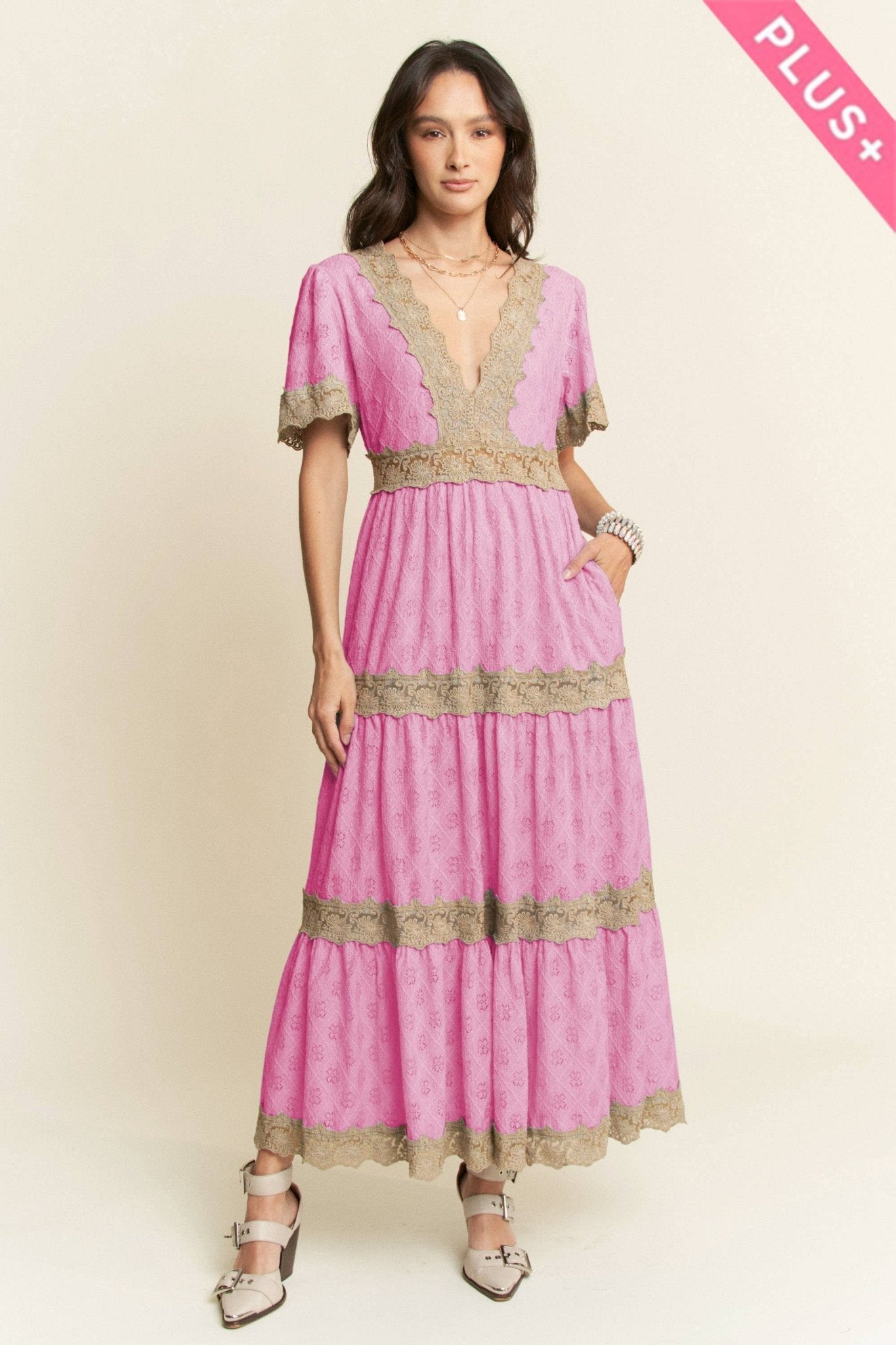 PLUS BURN-OUT TEXTURED FLORAL FABRIC TRIM LACE DETAILED FLUTTER SLEEVES V NECK SIDE ZIPPERED MAXI DRESS
