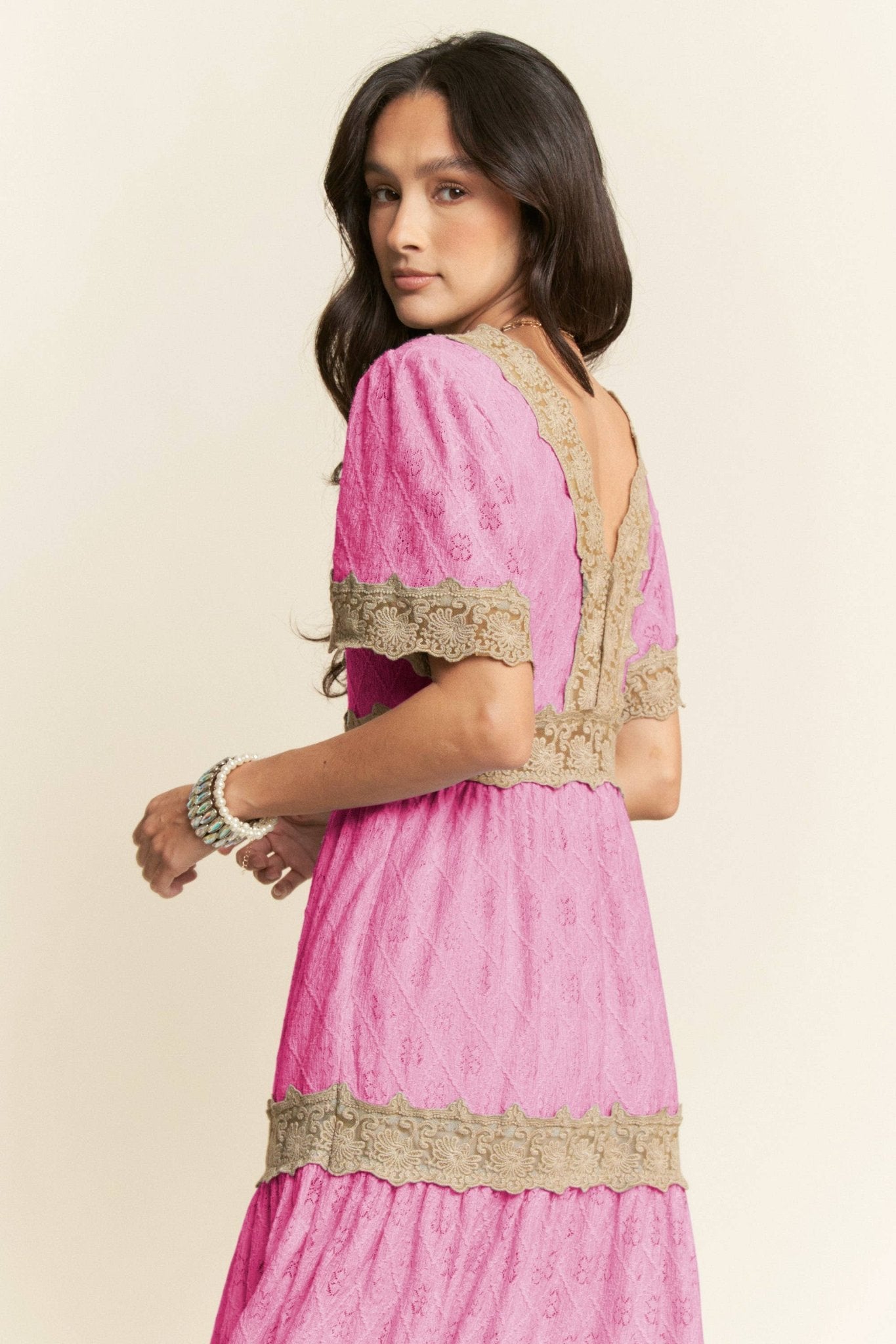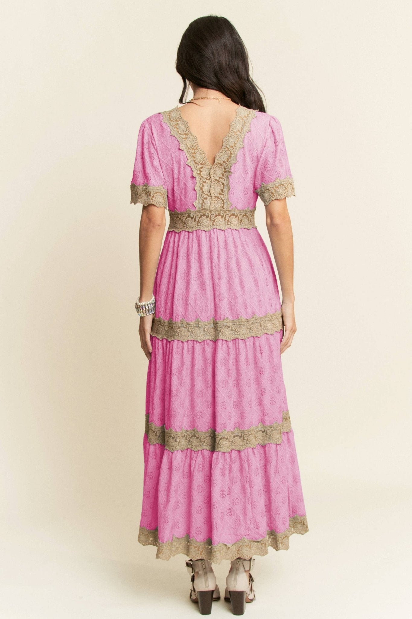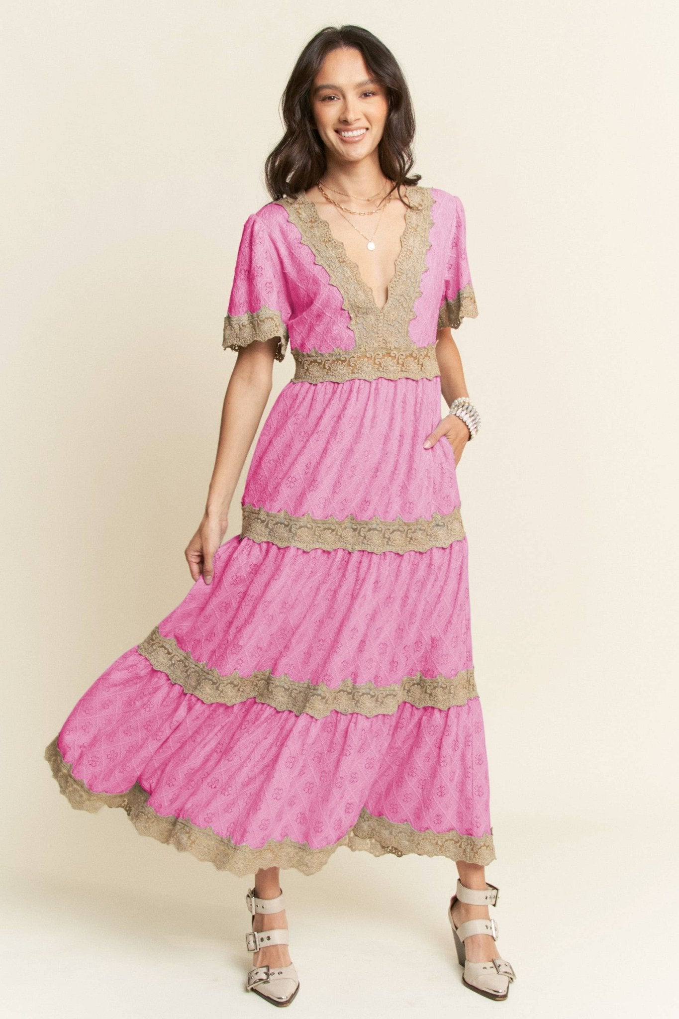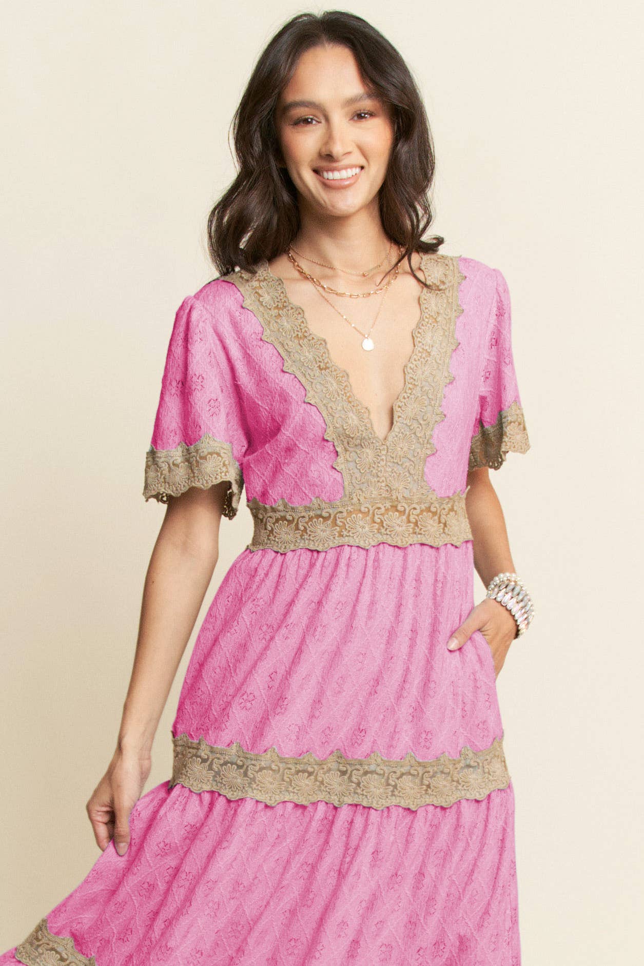 PLUS BURN-OUT TEXTURED FLORAL FABRIC TRIM LACE DETAILED FLUTTER SLEEVES V NECK SIDE ZIPPERED MAXI DRESS
