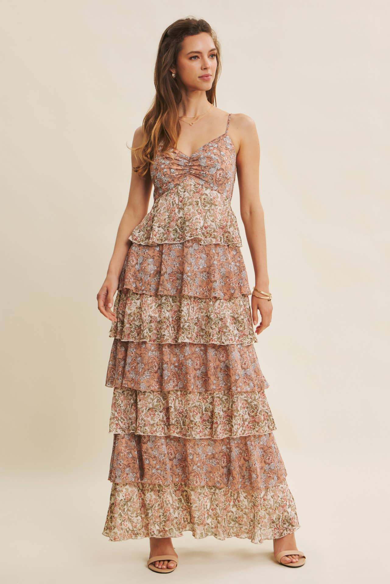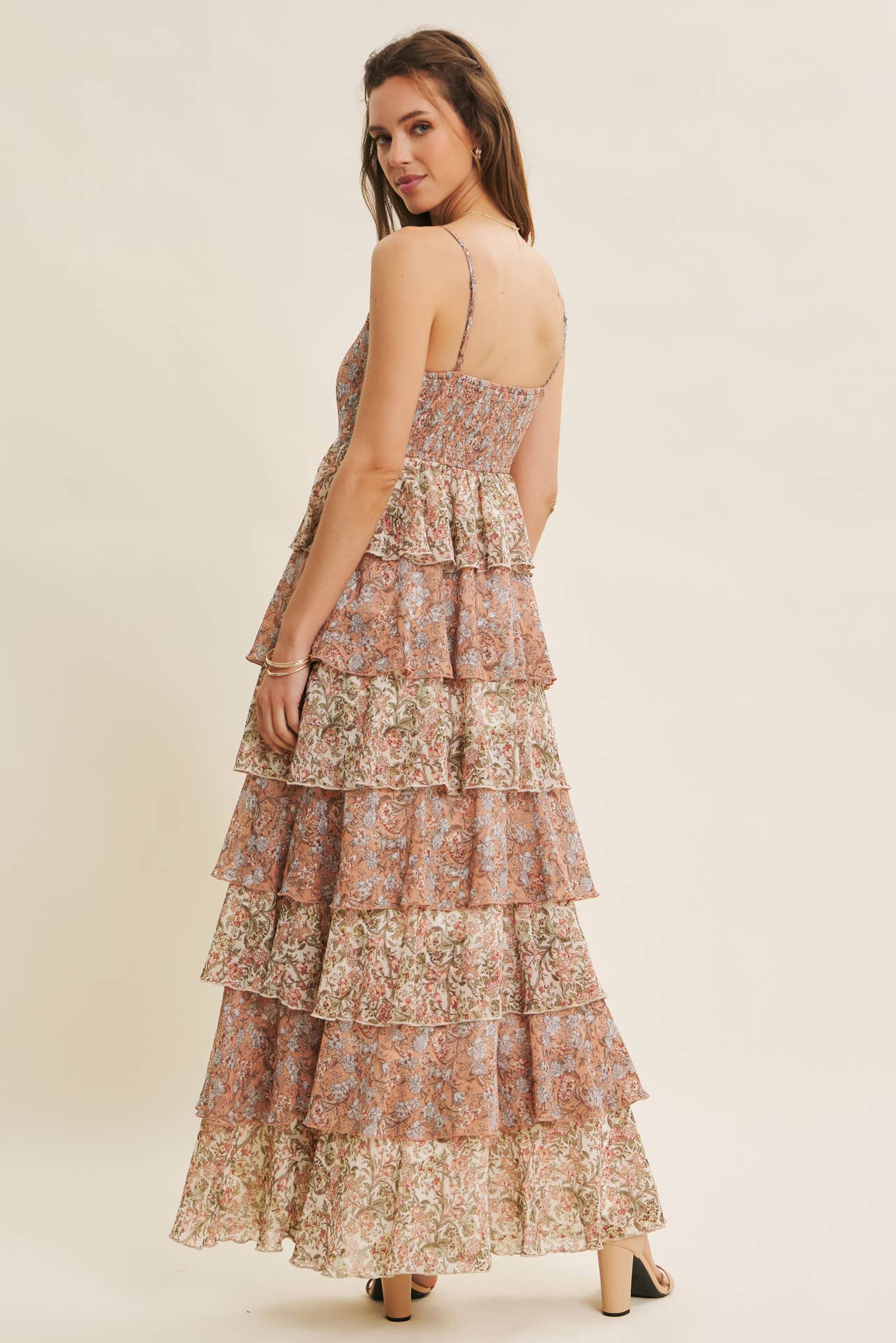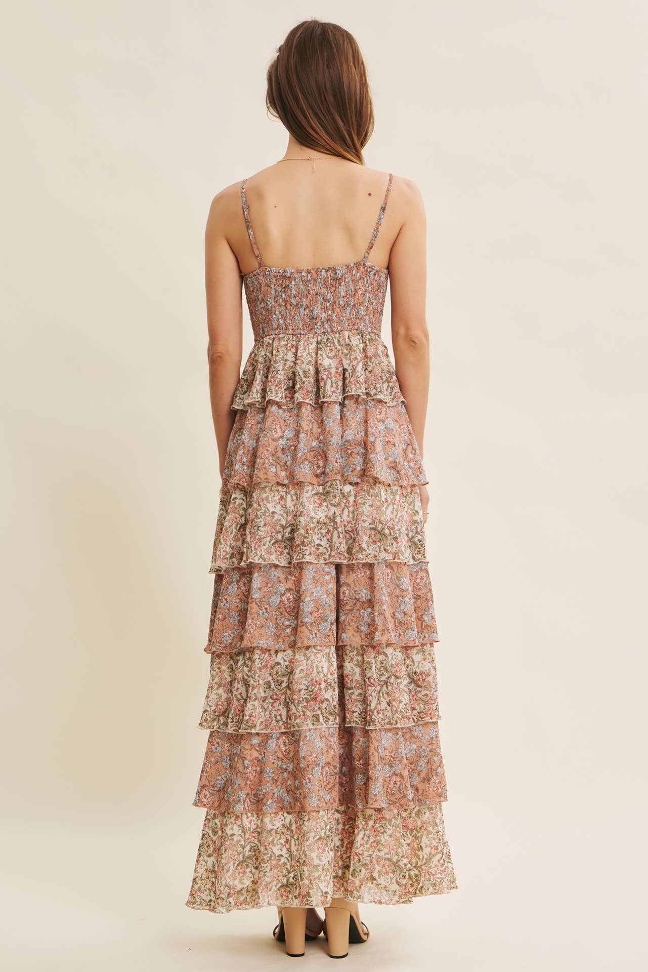 ROMANTIC FLORAL TIERED RUFFLE MAXI DRESS WITH SMOCKED BACK