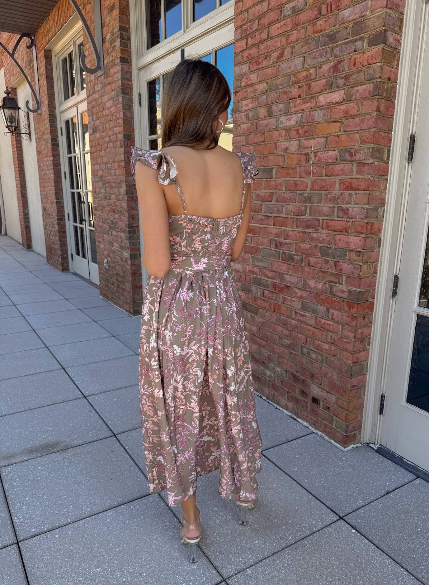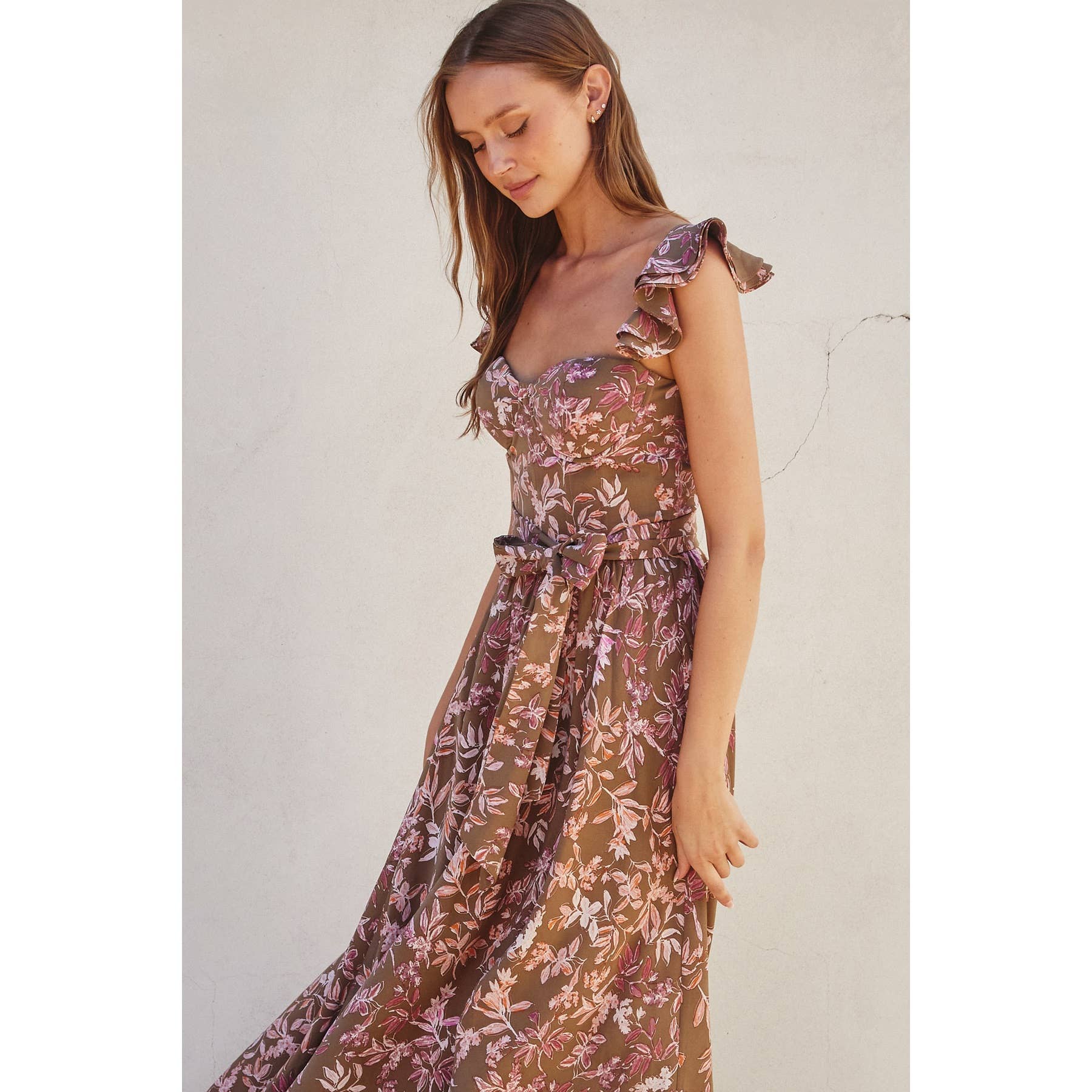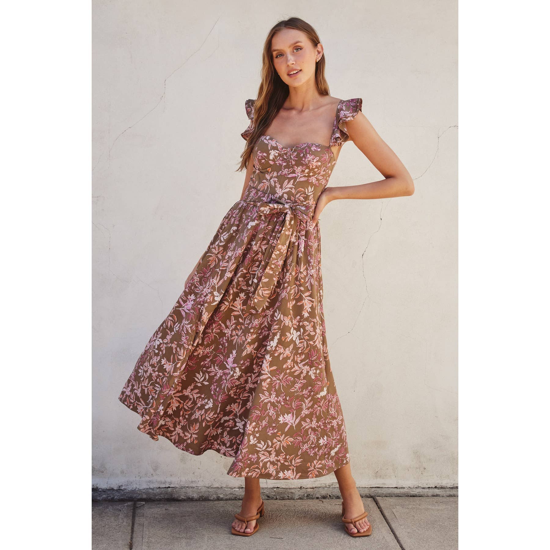 Taupe Floral Corset Flutter Midi Maxi Dress