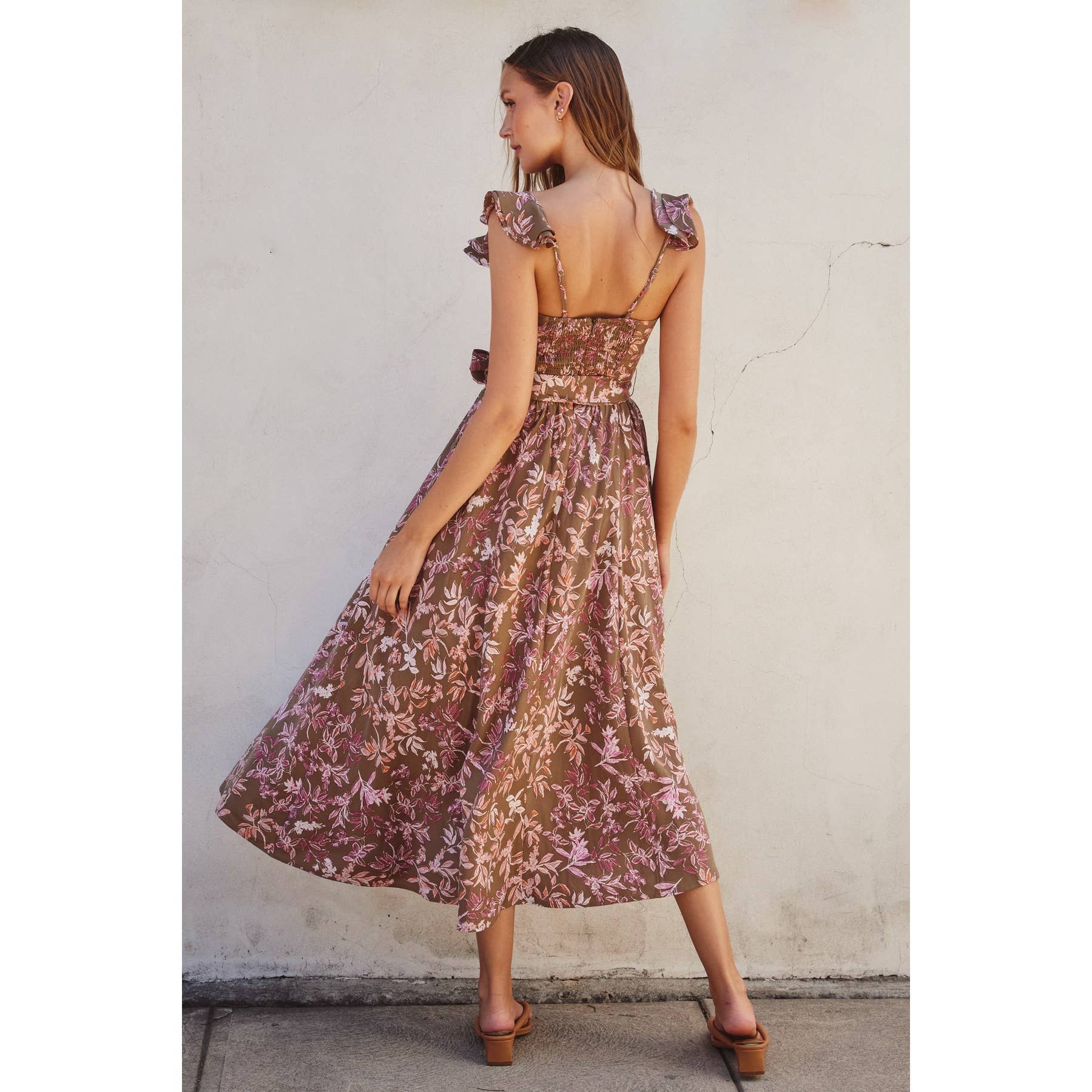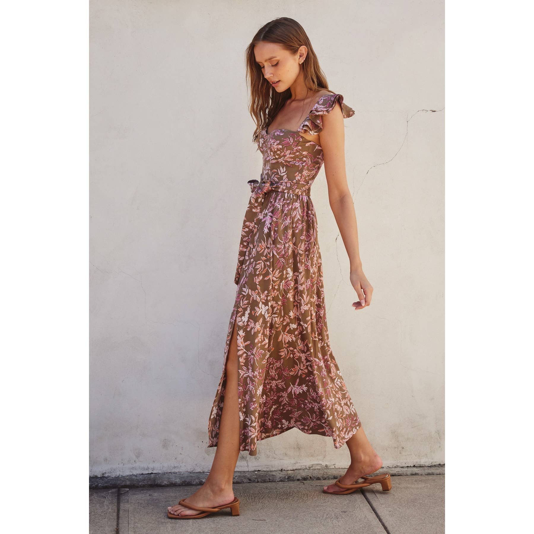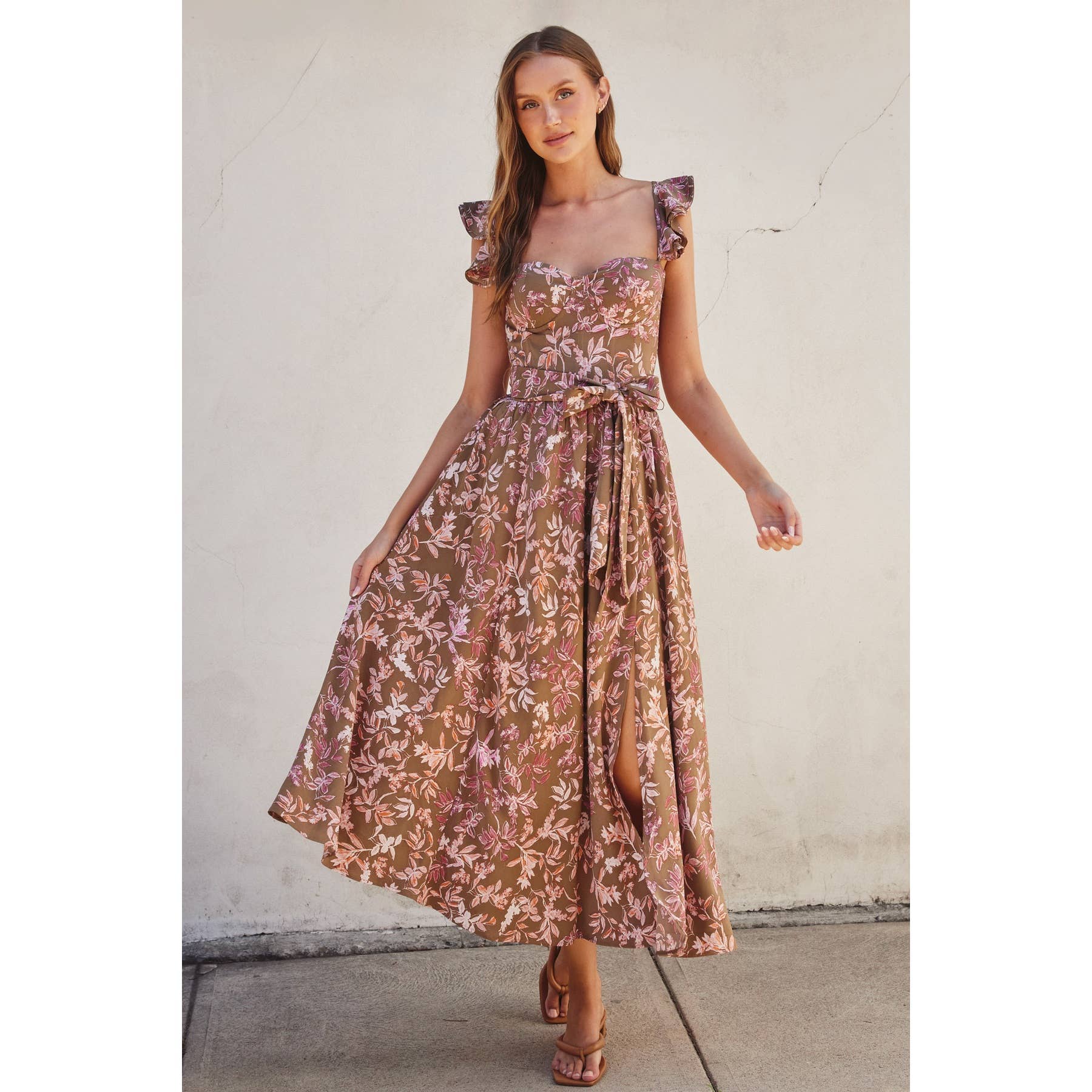 Taupe Floral Corset Flutter Midi Maxi Dress