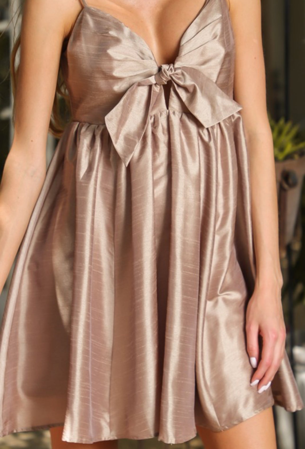 Taupe Shimmery Tie Front Mini Dress with Thin Adjustable Straps