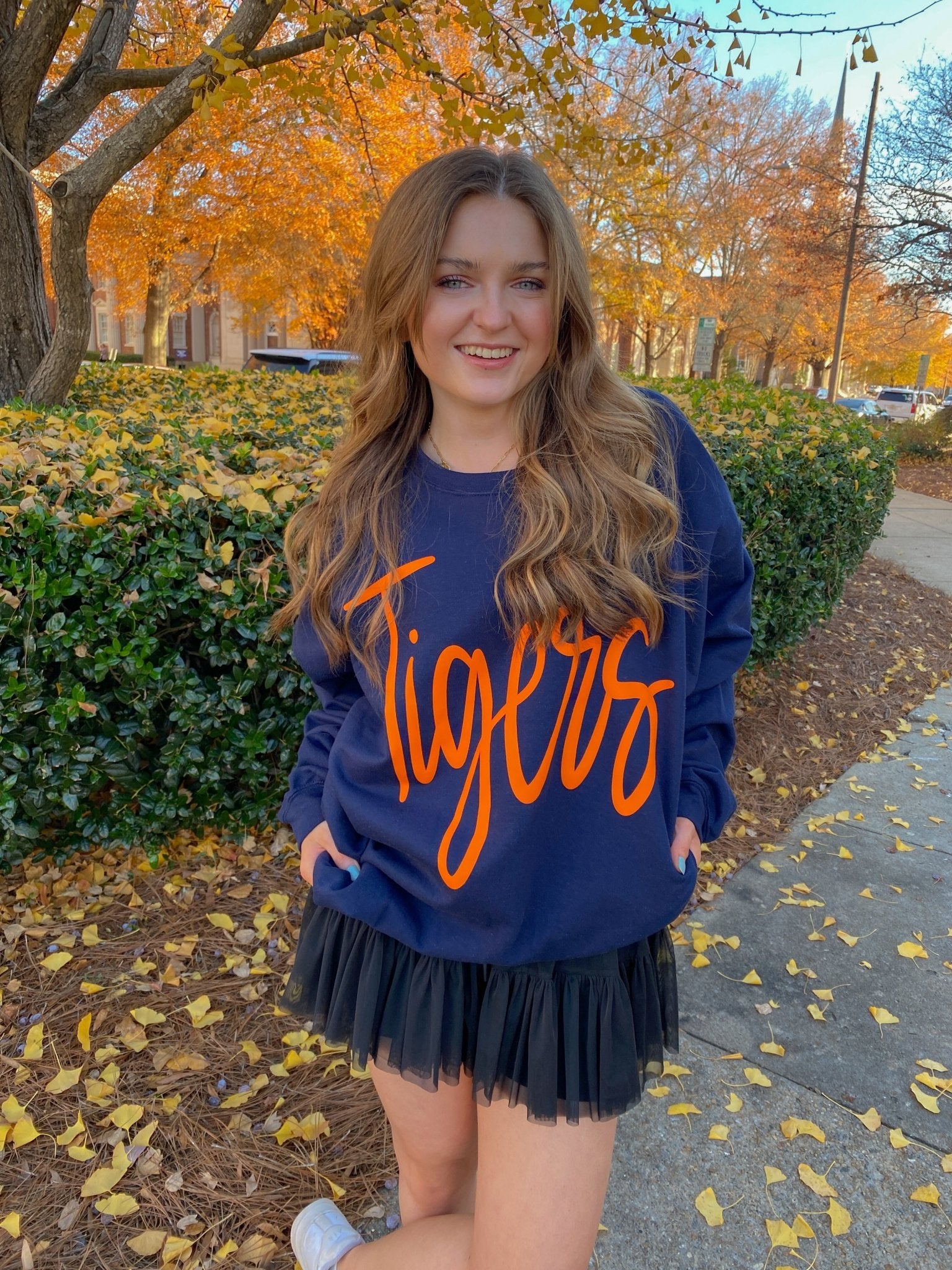 Jumbo Cursive Orange “Tigers” Puff Vinyl on Navy Sweatshirt