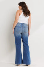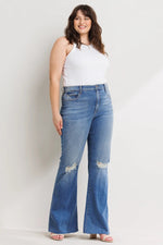 PLUS HIGH RISE DISTRESSED MEDIUM DENIM FLARES WITH RAW HEM