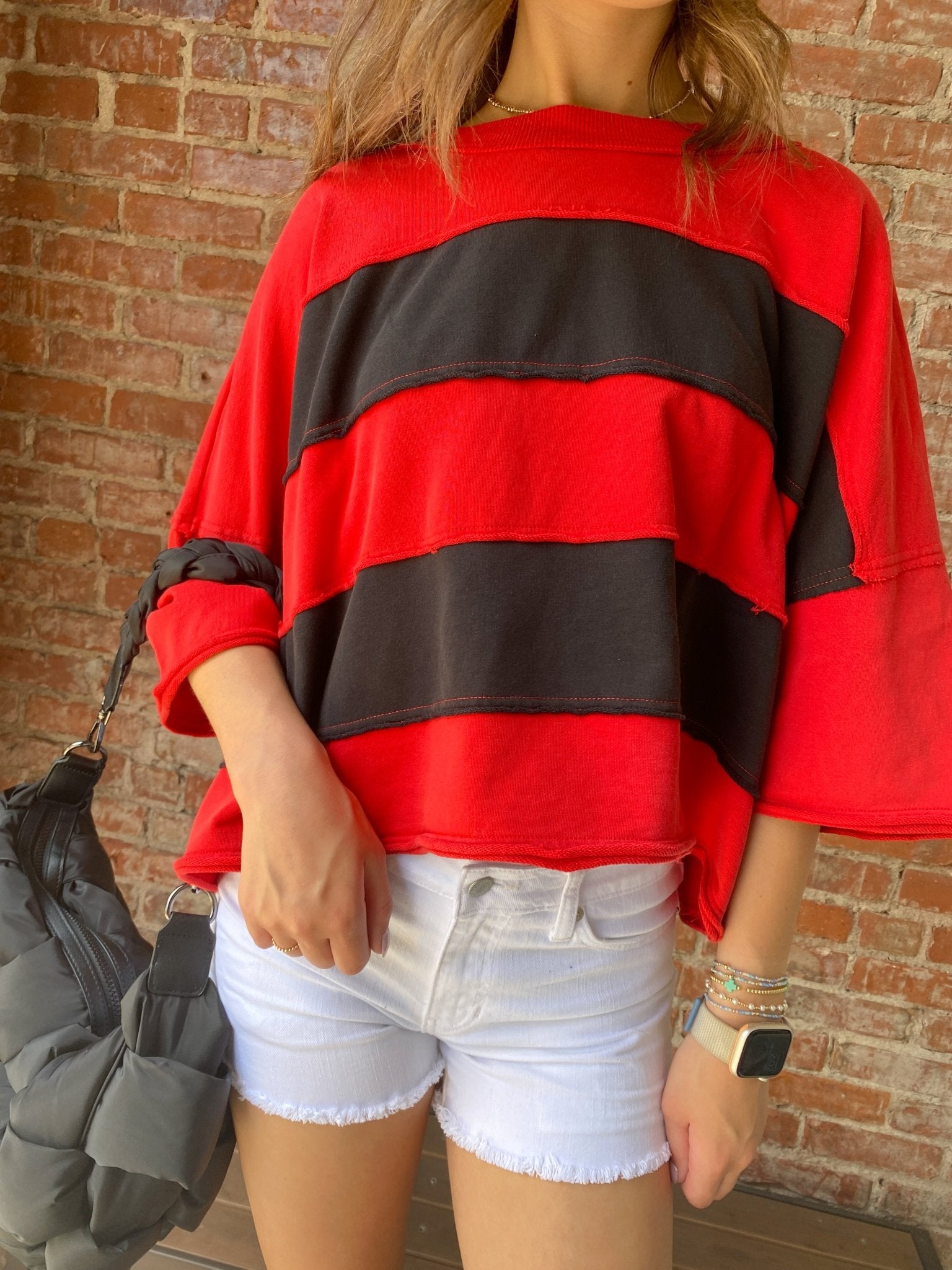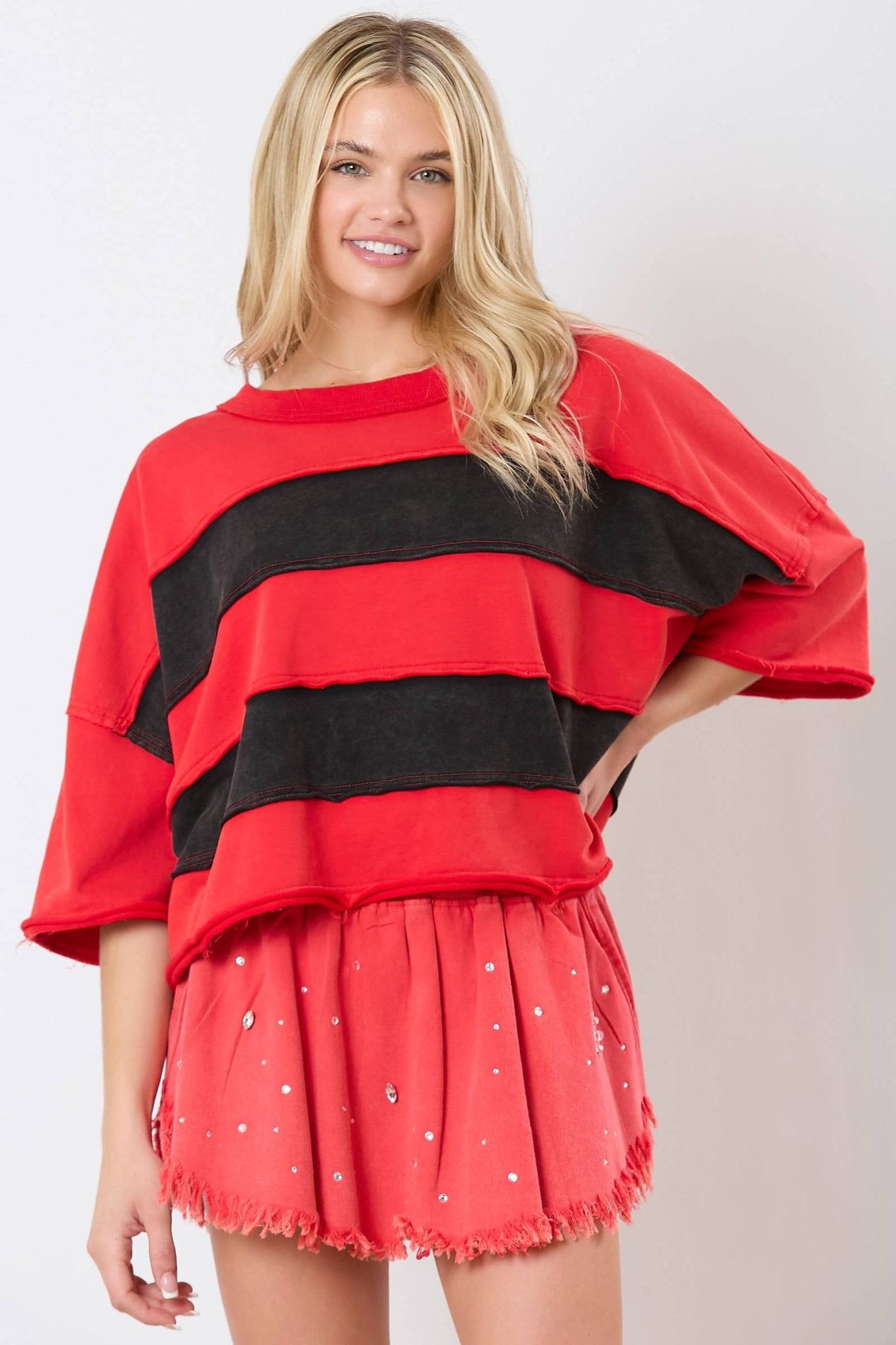 RED AND BLACK RAW EDGE DETAIL COLOR BLOCK CROP T-SHIRT