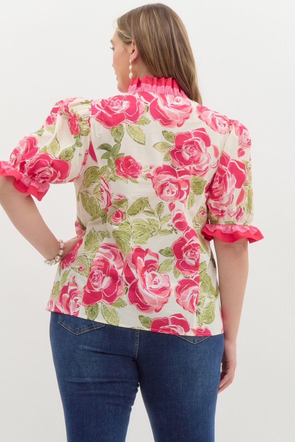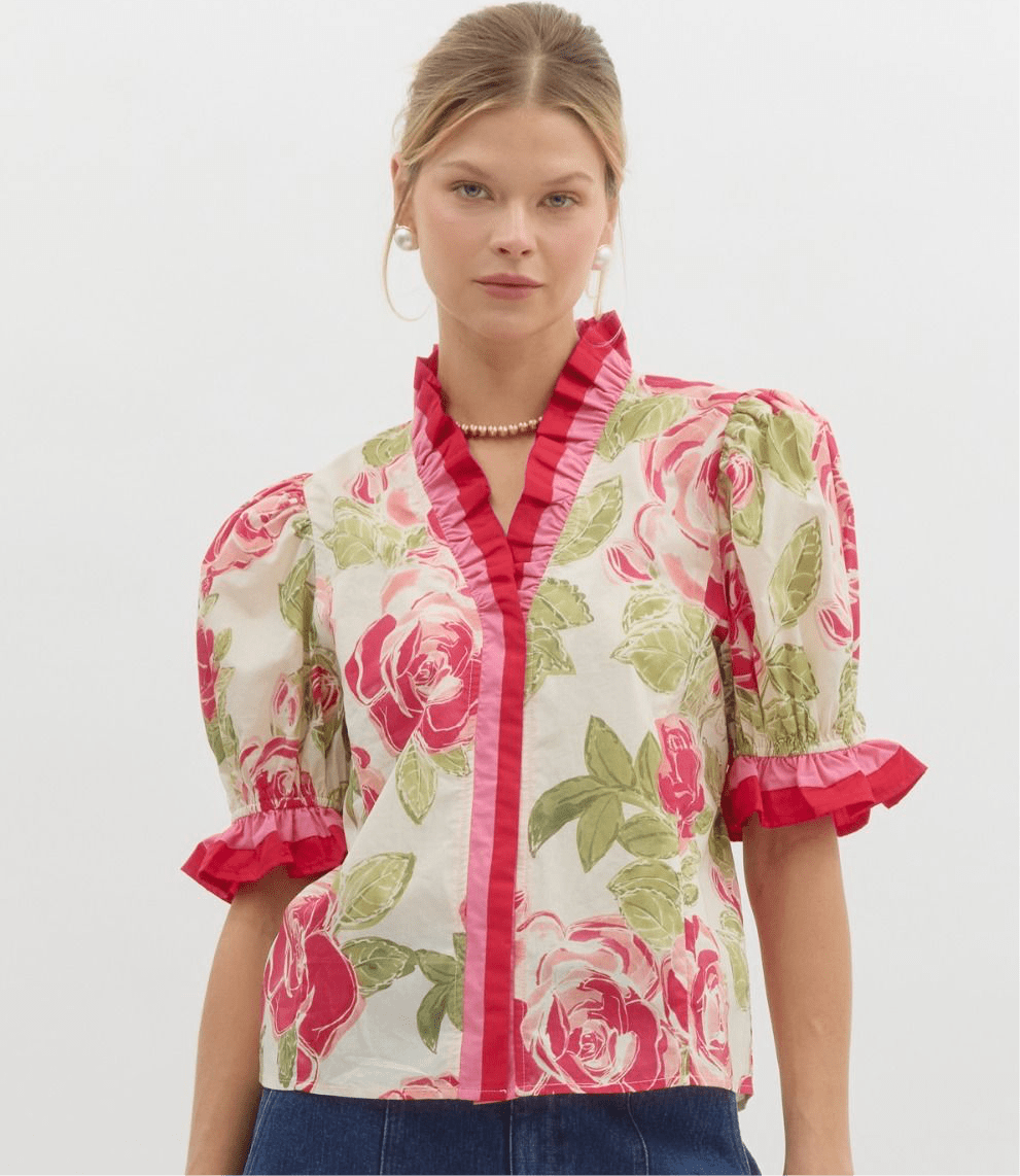This Secret Garden Pink and Green Floral Top features a floral print with short puff sleeves, an elasticated waist, and a multicolor contrast design with a delicately accented ruffle detailed v-neck. It is unlined and made from a lightweight, non-sheer woven material.