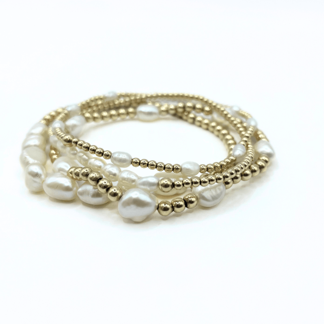 14k gold filled and waterproof beaded bracelet with beautiful, fresh-water baroque pearls all around. Every pearl is slightly different. Wear single or stack it. Part of our erin gray waterproof collection. Available in 6.5" and 7" stretch