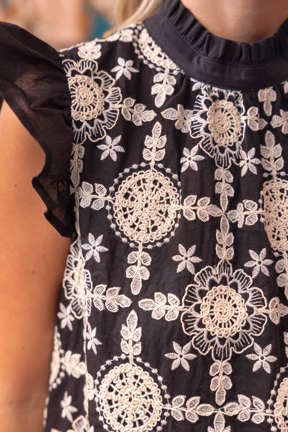 Black Cotton Embroidered Ruffle Sleeve Back Ribbon Tie Dress