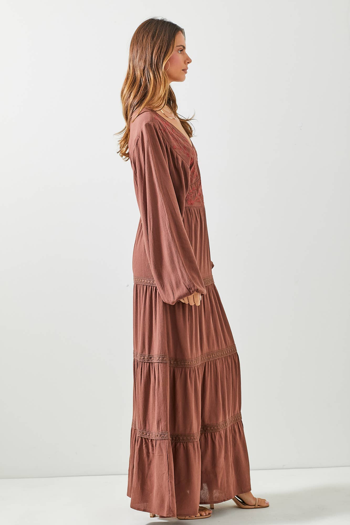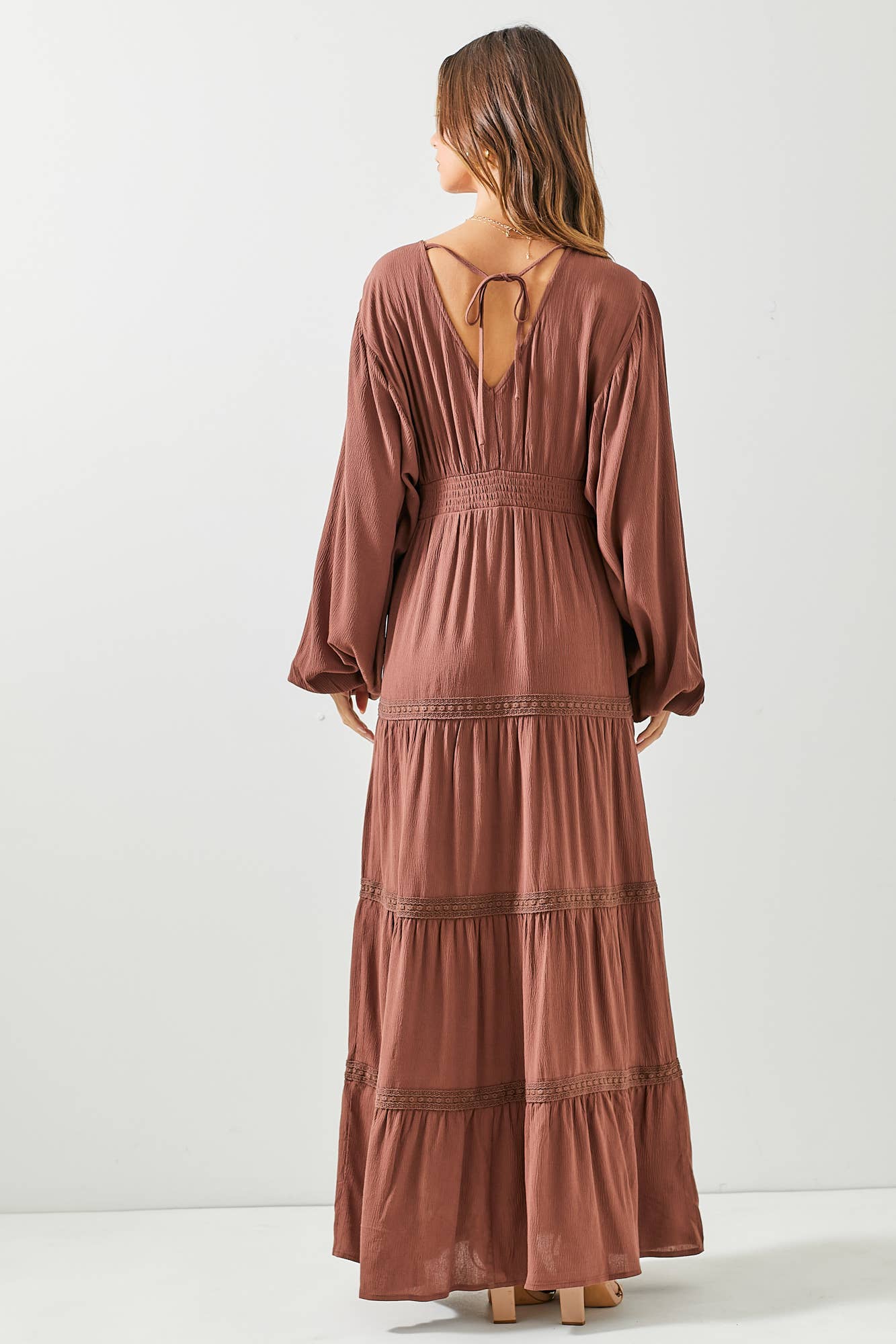 The Brown embroidered V-neck maxi dress features long balloon sleeves, a front and back V-neck, a tiered skirt, and a back tie.
