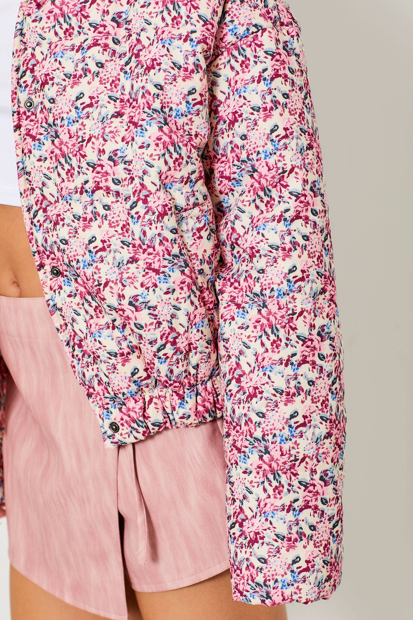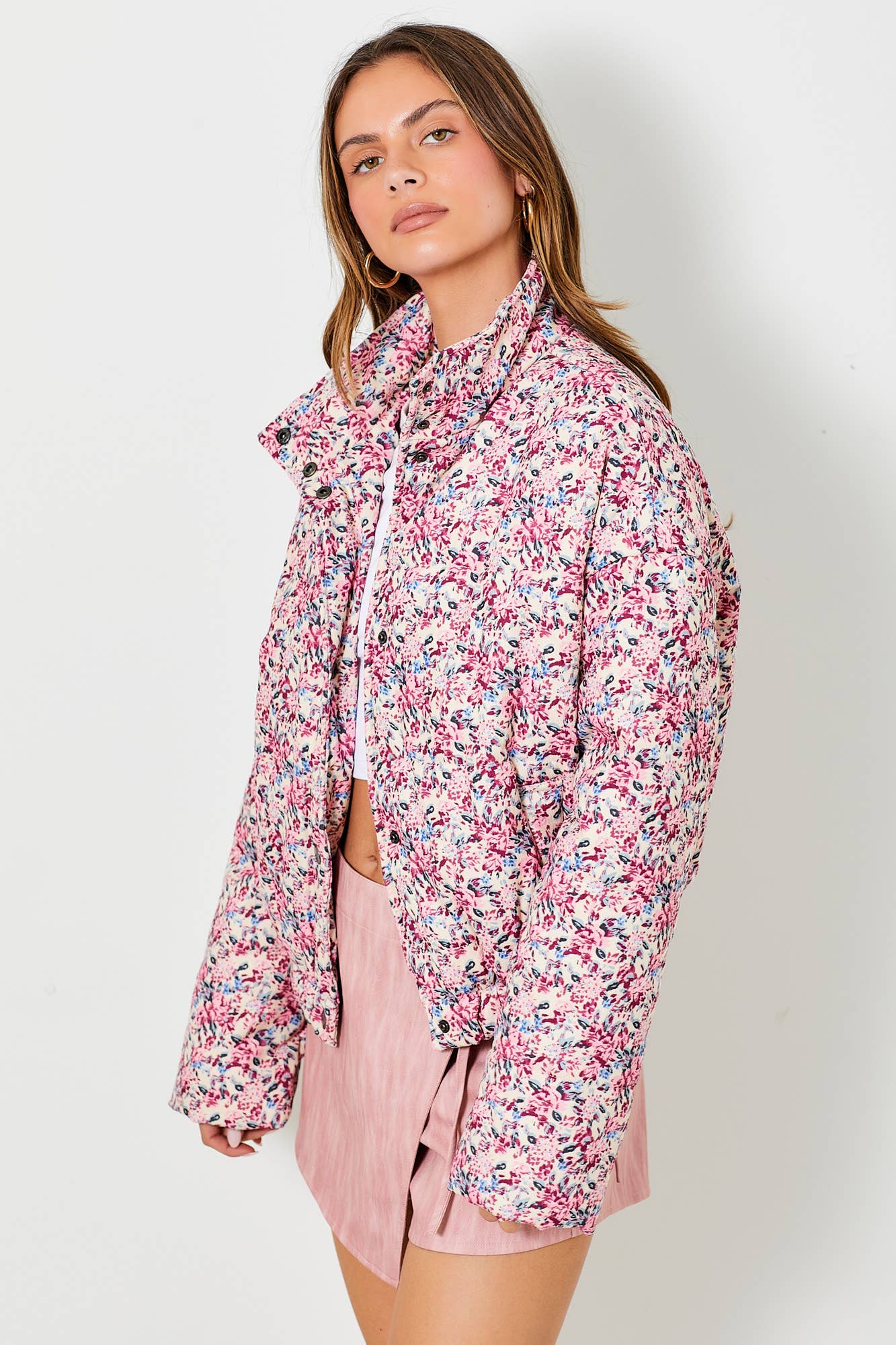 CREAM AND ROSE FLORAL PRINT CORDUROY PUFFER JACKET