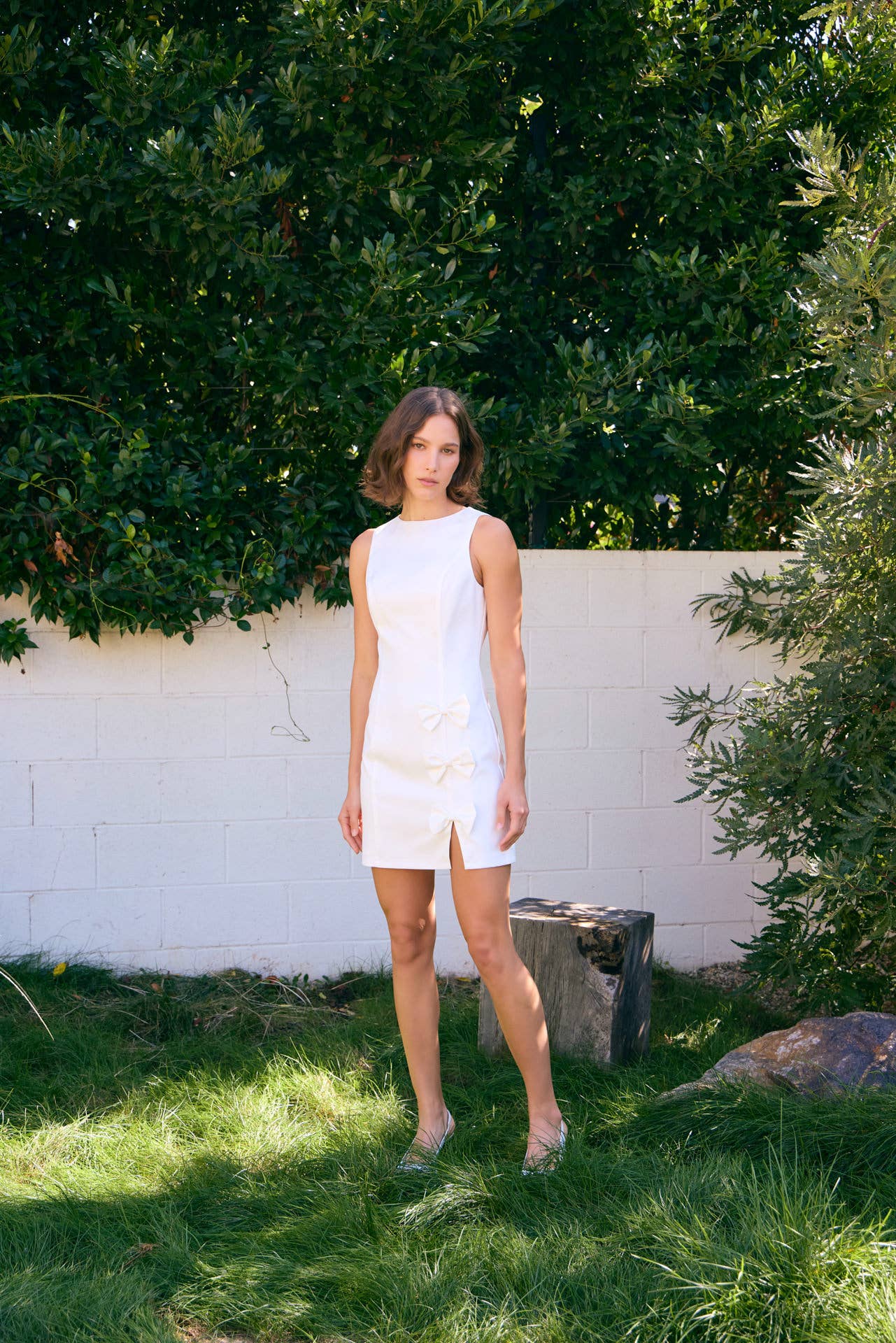 This statement-making bodycon mini dress is featured in a figure-flattering silhouette with slit and bow details.