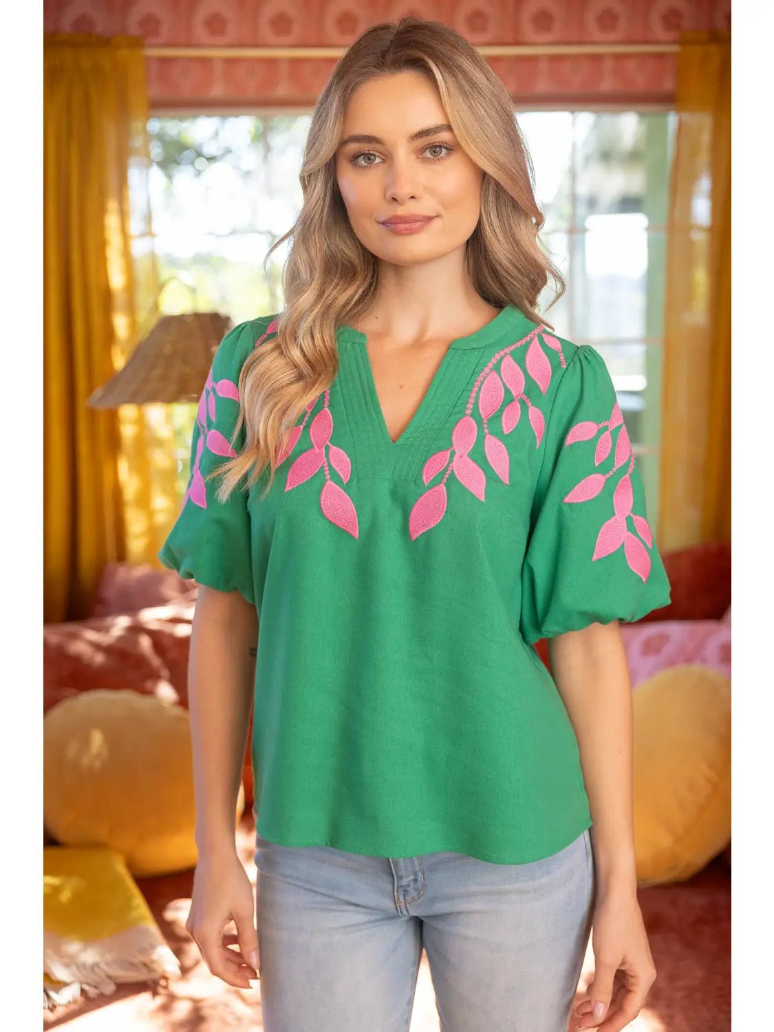 Green & Pink Floral Embroidered Bubble Sleeve V-Neck Top