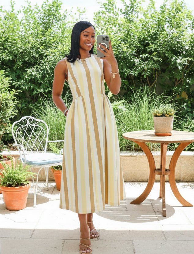 Neutral & Yellow Striped Midi Dress With Pockets