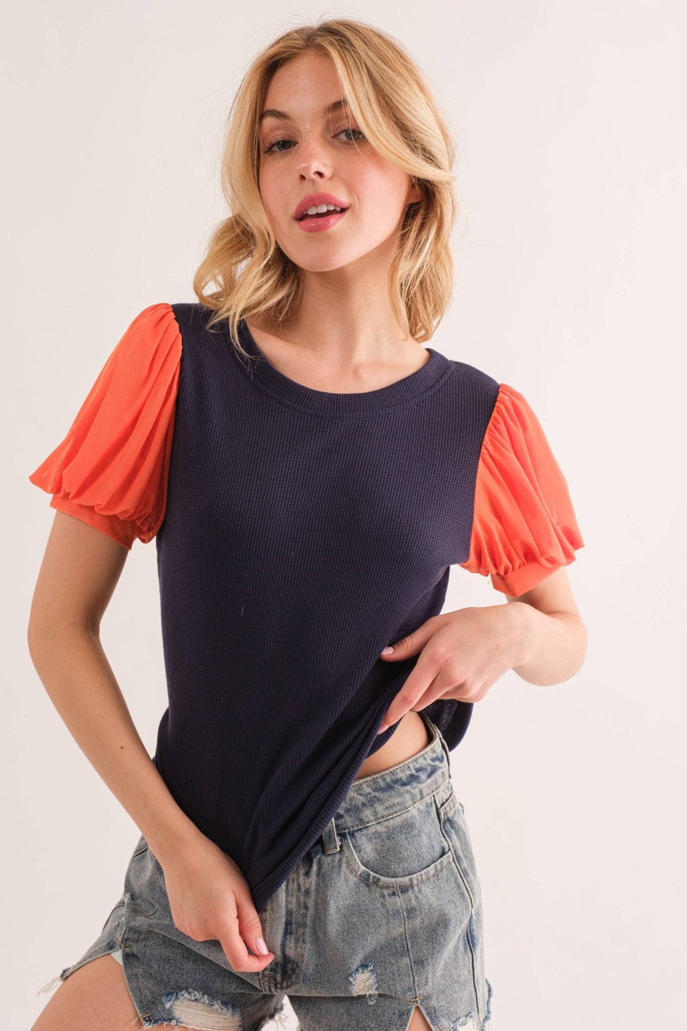 ORANGE AND NAVY GAME DAY CONTRAST SHORT SLEEVE TOP