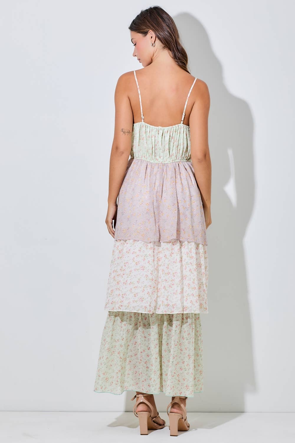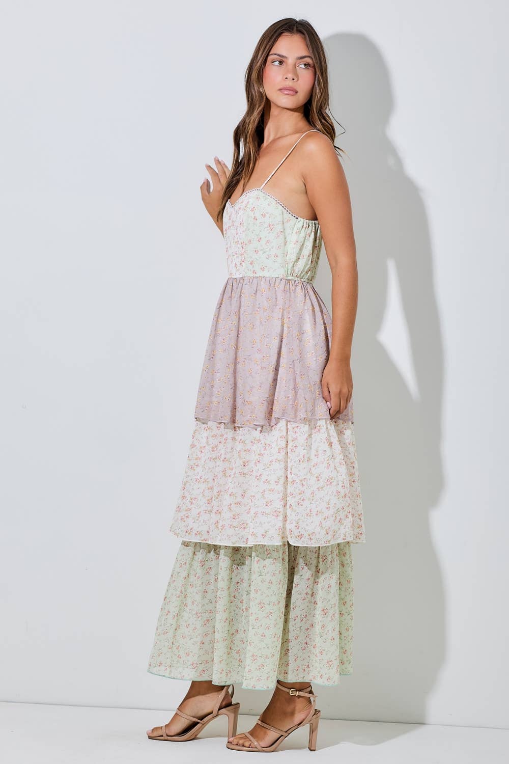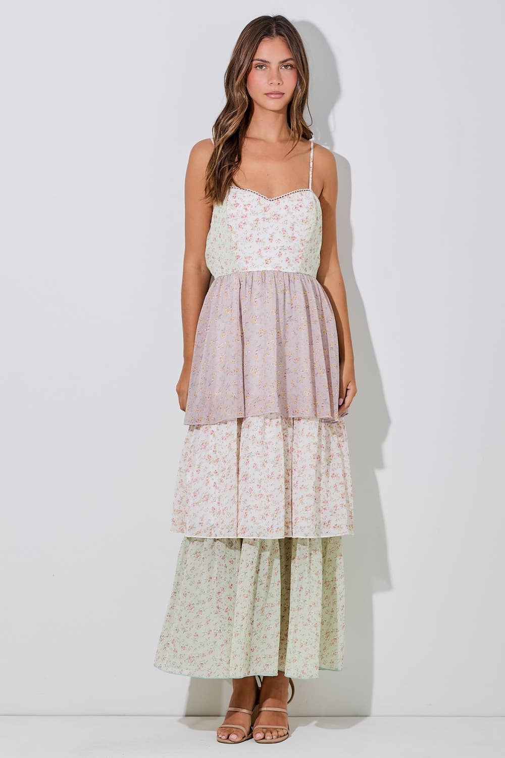 Twirl into spring in this dreamy maxi sundress that's equal parts romantic and fun. Soft pastel florals dance across delicate tiered layers that give you effortless volume and movement with every step. Adjustable spaghetti straps and a smocked back keep you comfortable all day long, while subtle lace detailing adds that extra touch of elegance. Whether you're heading to a bridal shower, garden party, or your next beach getaway, this A-line beauty delivers resort-ready style that feels as good as it looks.