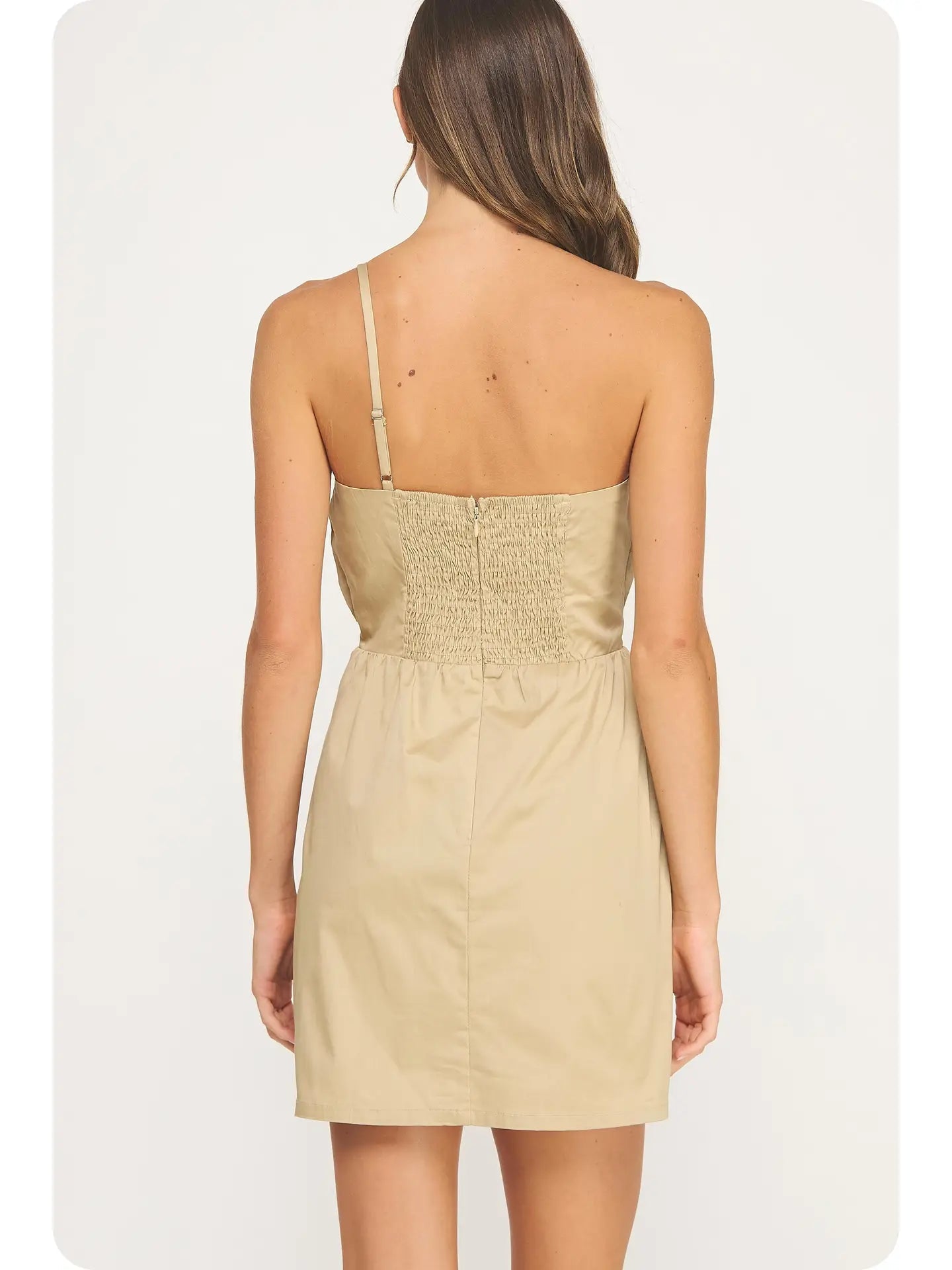 Taupe Knot twisted mini dress in stretch twill fabric. This mini dress features an unique twisted and pleated bow at front, bodice with one shoulder construction with adjustable strap, smocking at back, mini skirt, and lining.
