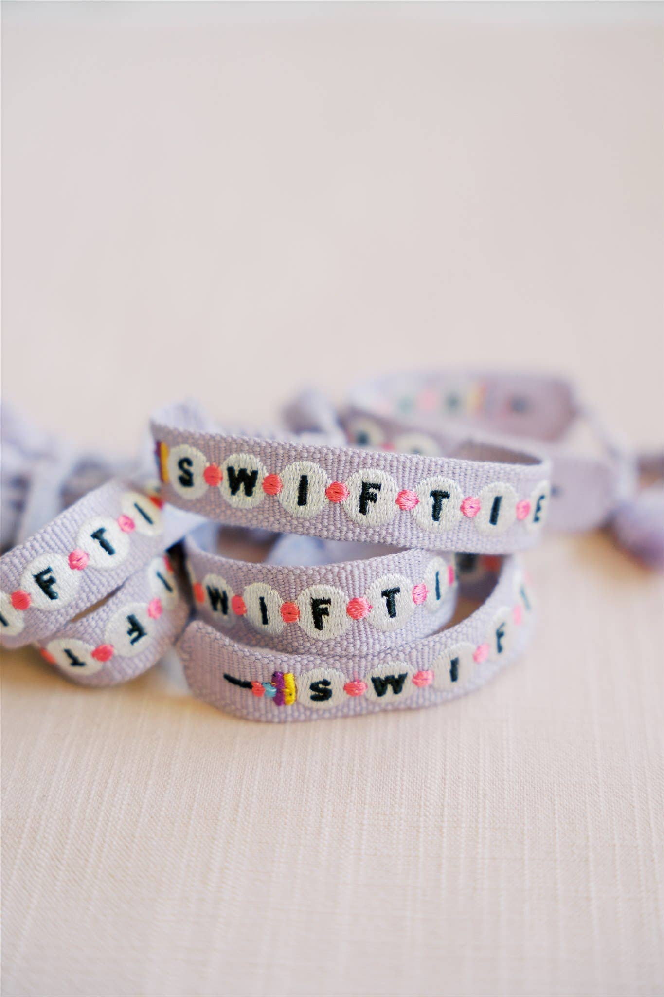 This adorable purple Swiftie bracelet is perfect in the friendship bracelet era! The bracelet has easy adjustable ties and fringe tassels.