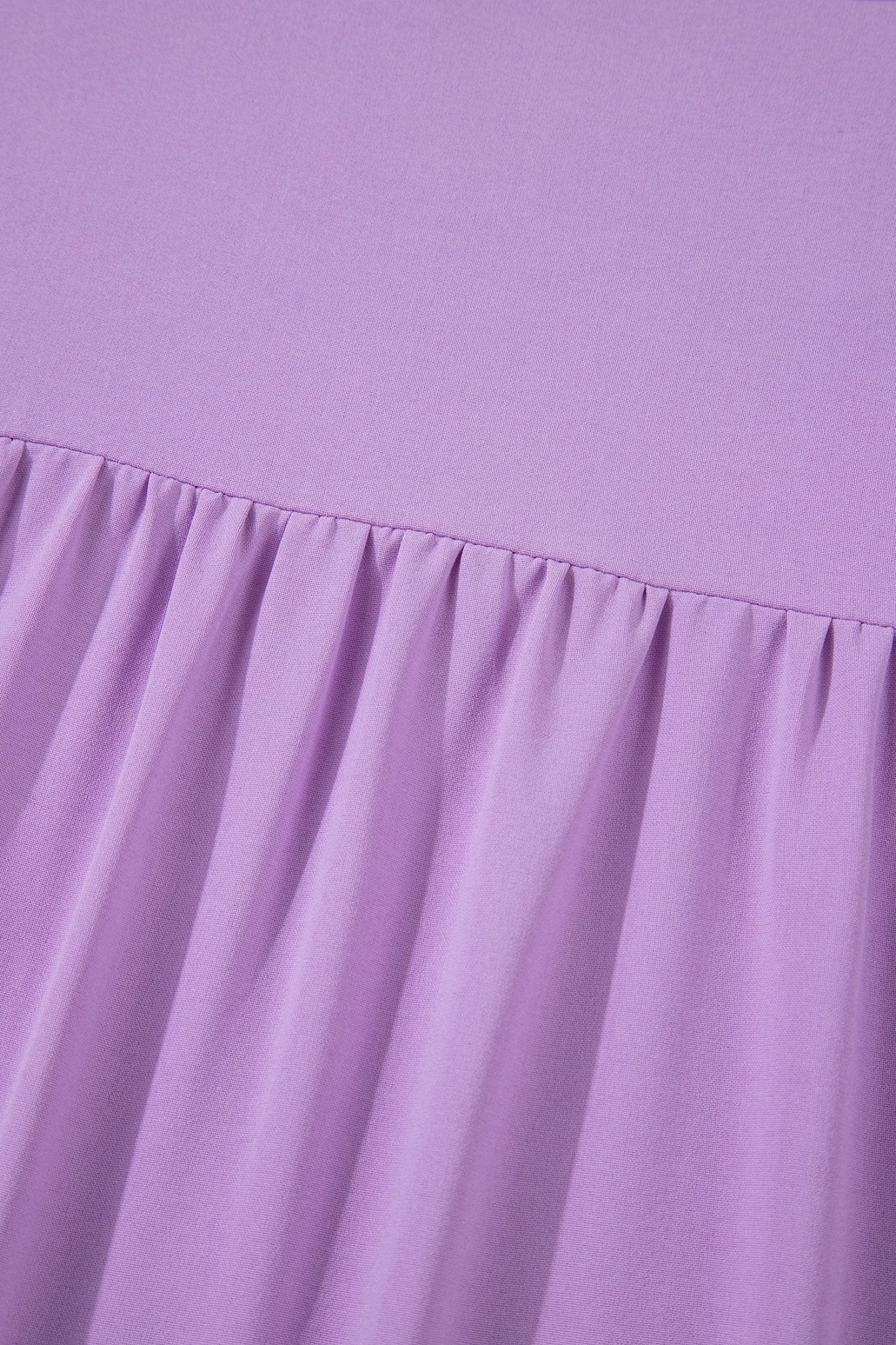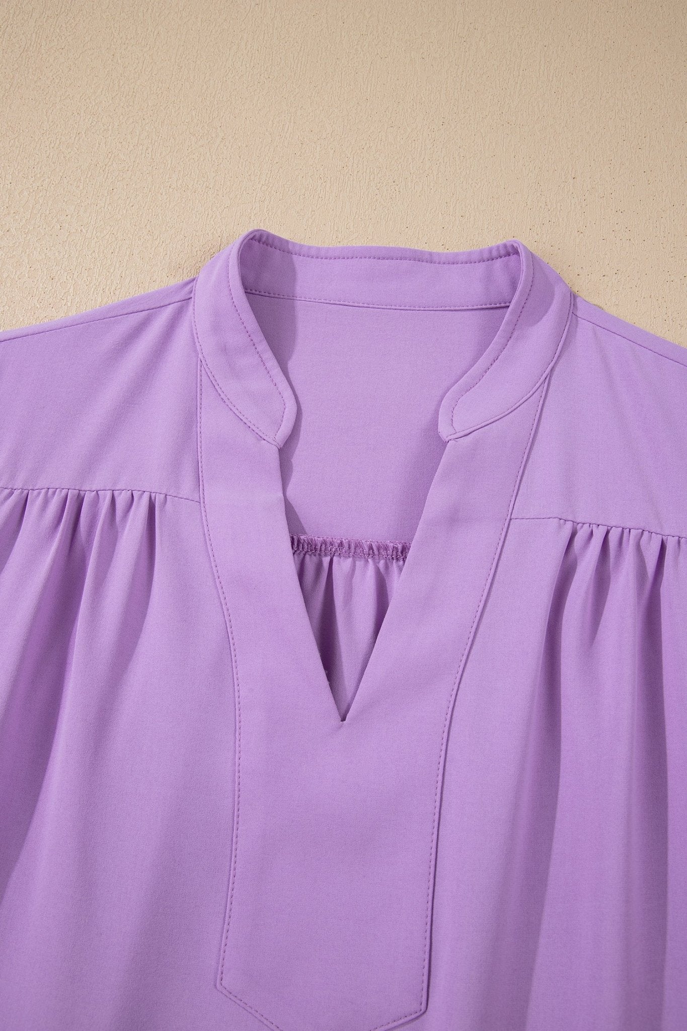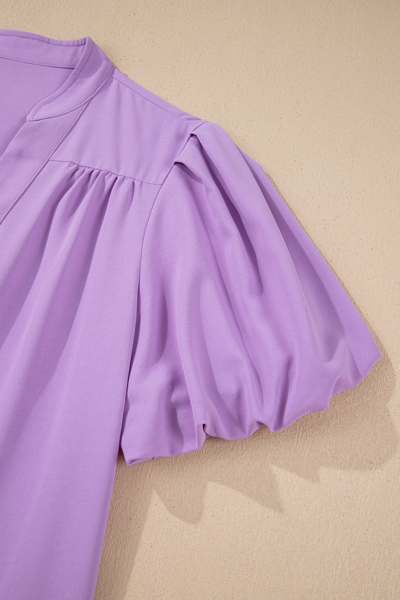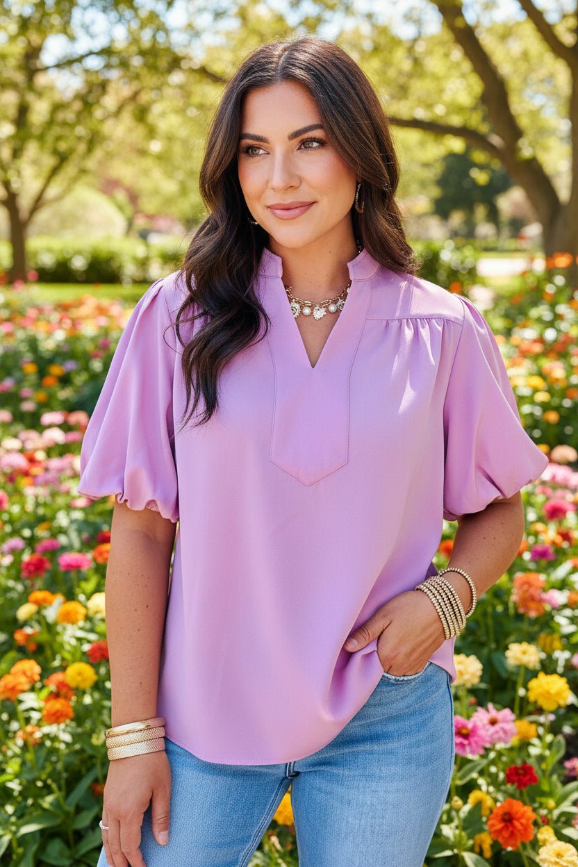 Soft lilac blouse with a flattering V-neck and charming puff sleeves. Made from easy-care polyester that keeps its shape wash after wash. Perfect for adding a pop of color to your everyday rotation.