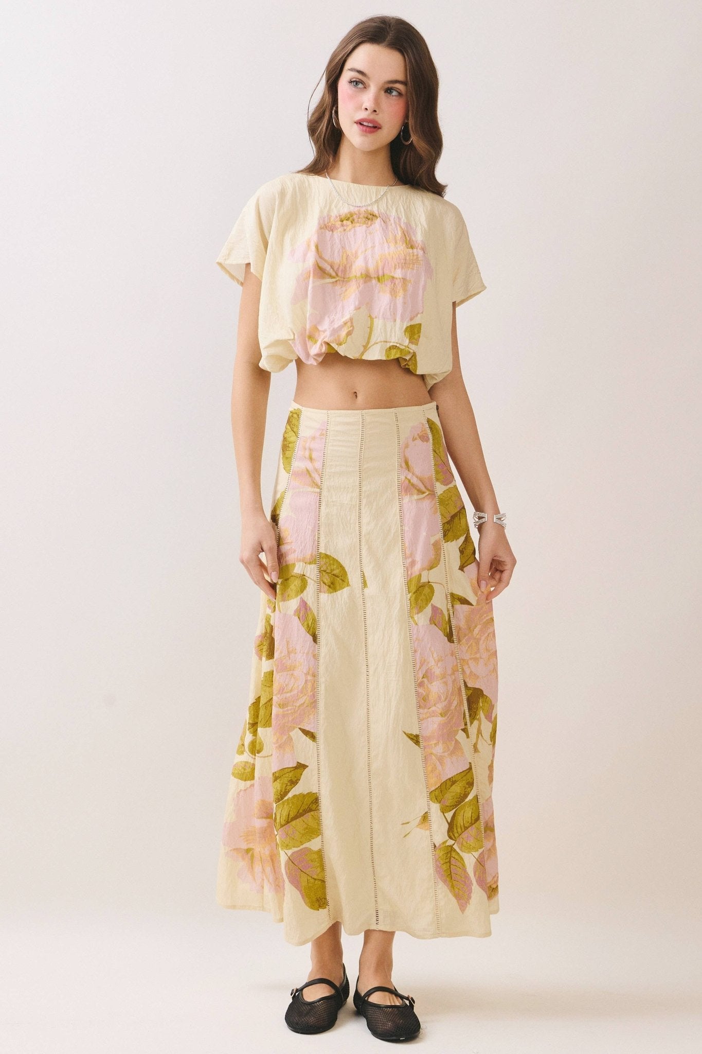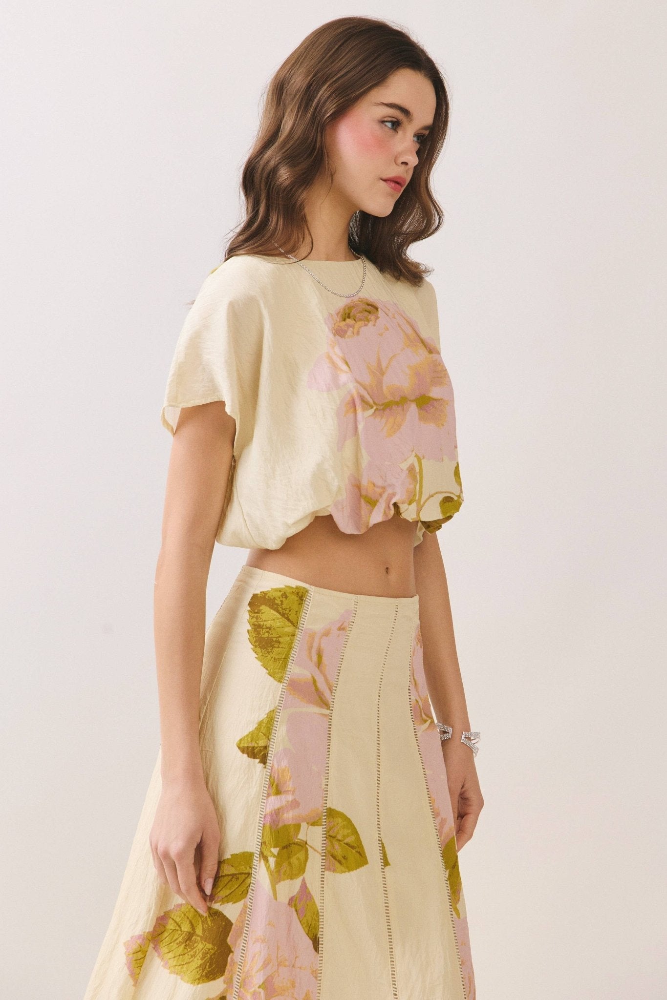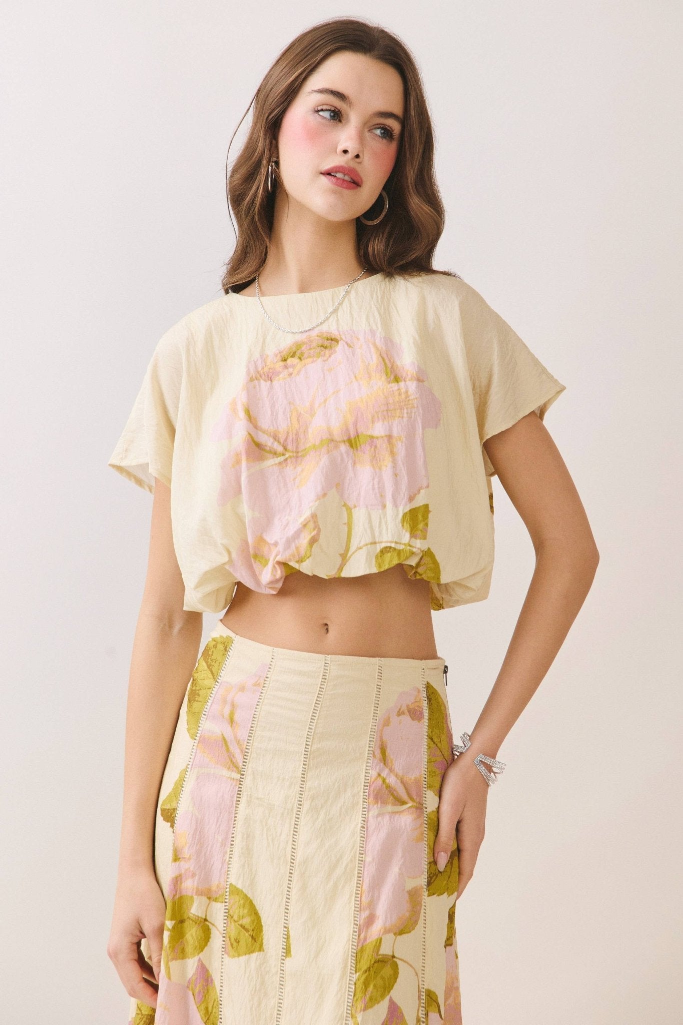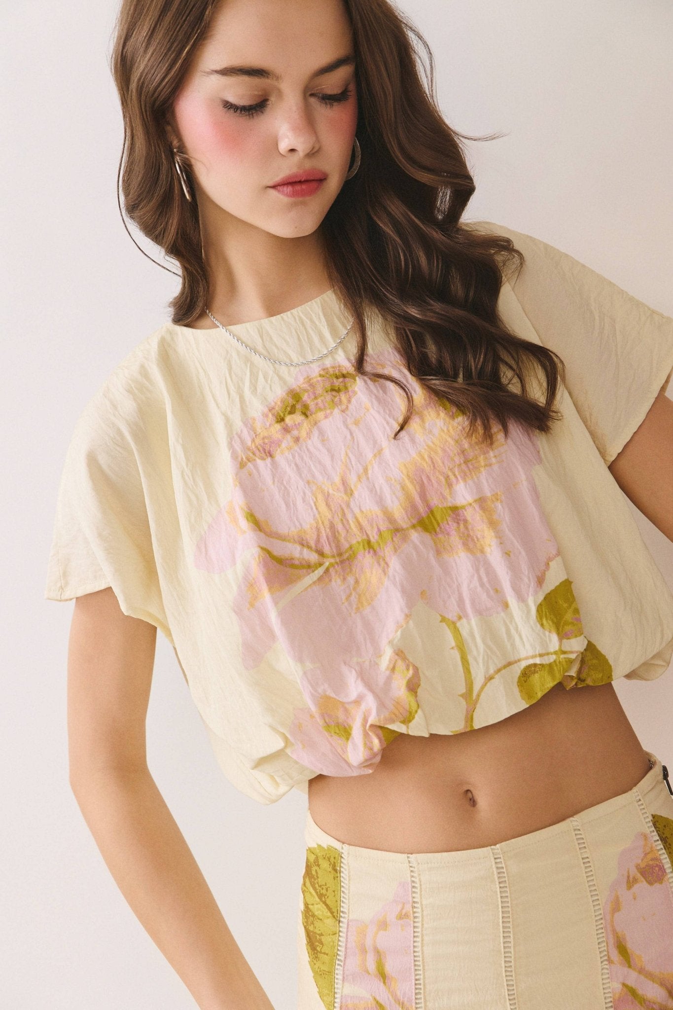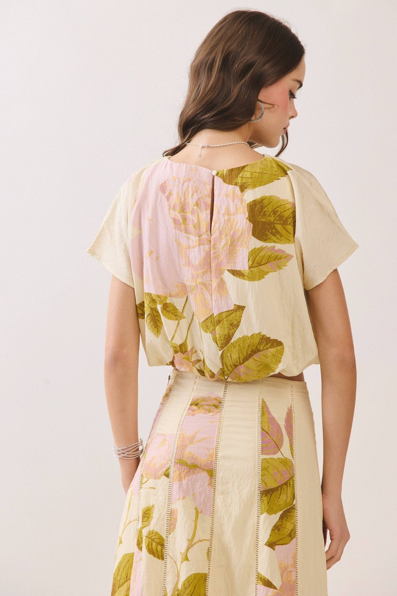 A floral-print cropped top featuring a relaxed boxy silhouette and short sleeves. Designed with a soft round neckline and subtle drape. Finished with a back keyhole button closure. Model Size + Fit: Model height: 5'11" Dress size: Small Bust: 31.5 Waist: 23.5 Hips: 35